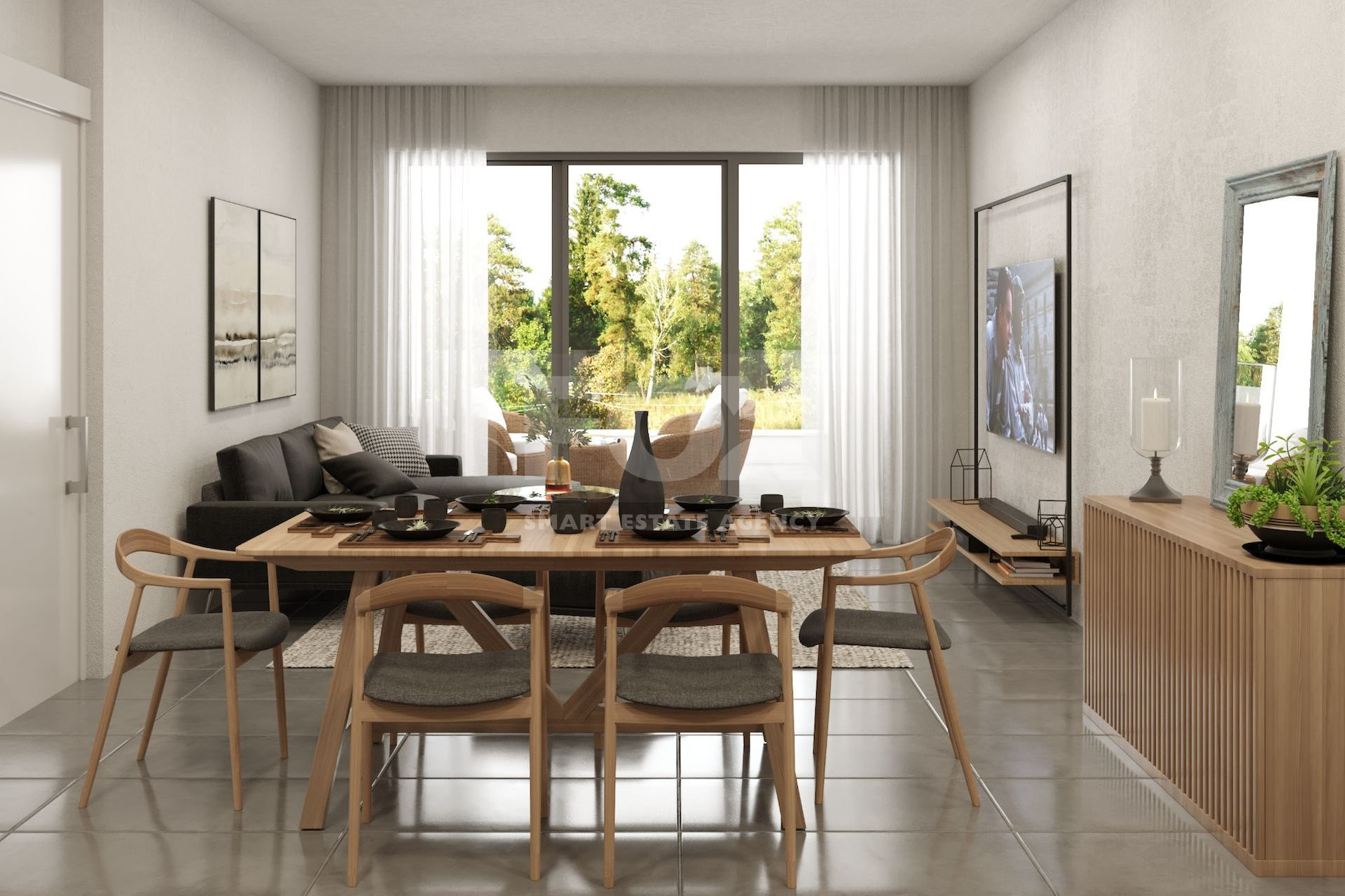 Located on the first floor of a three-story building, the apartment offers a spacious internal area of 89 sqm, complemented by a generous 20.59 sqm covered veranda. The layout is open-plan, with a stylish kitchen seamlessly integrated into the living and dining areas, creating an inviting space for relaxation and entertaining. It includes a main bathroom and two well-sized bedrooms, with the master bedroom featuring an en-suite bathroom with a toilet and shower for added privacy.