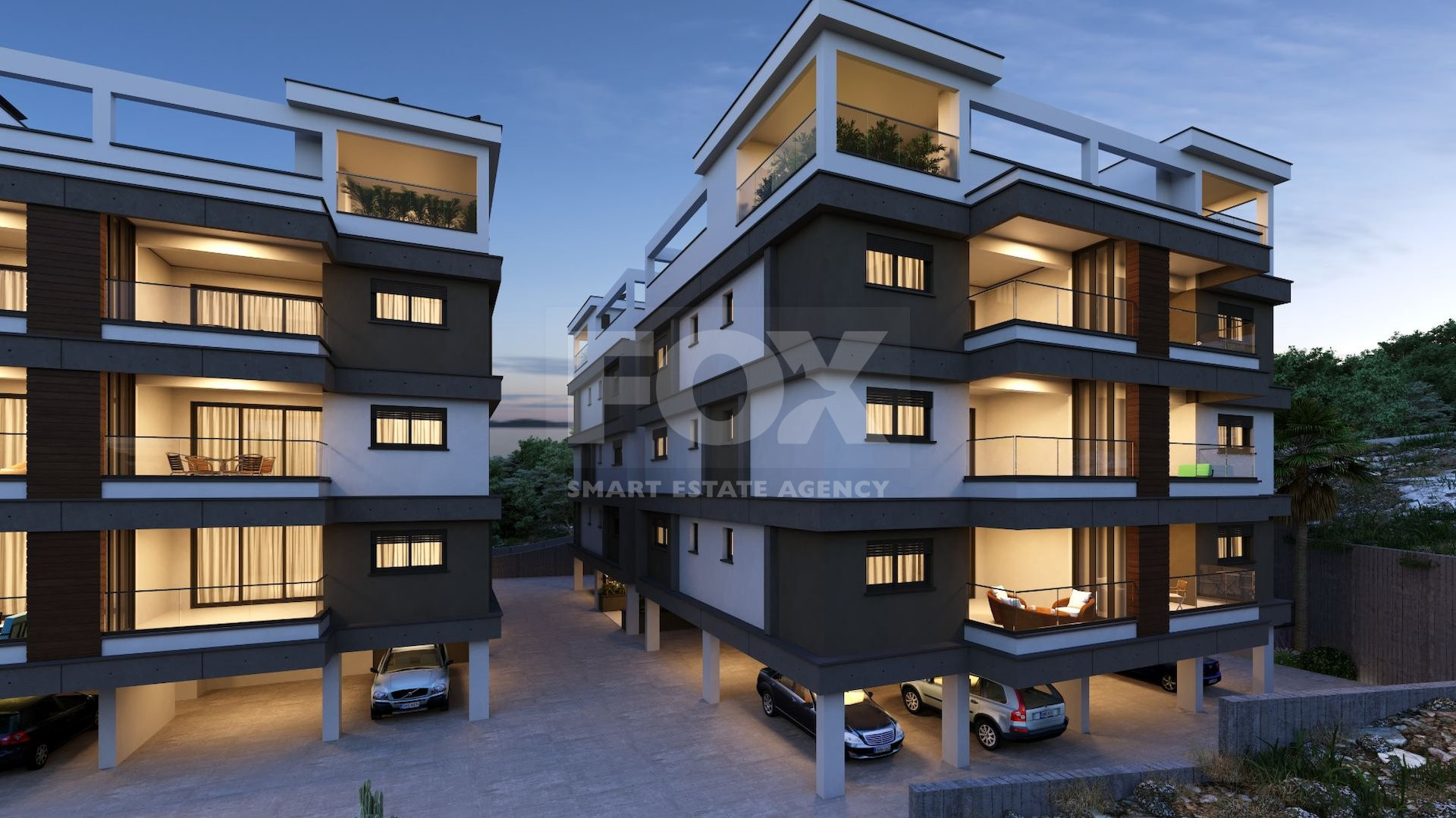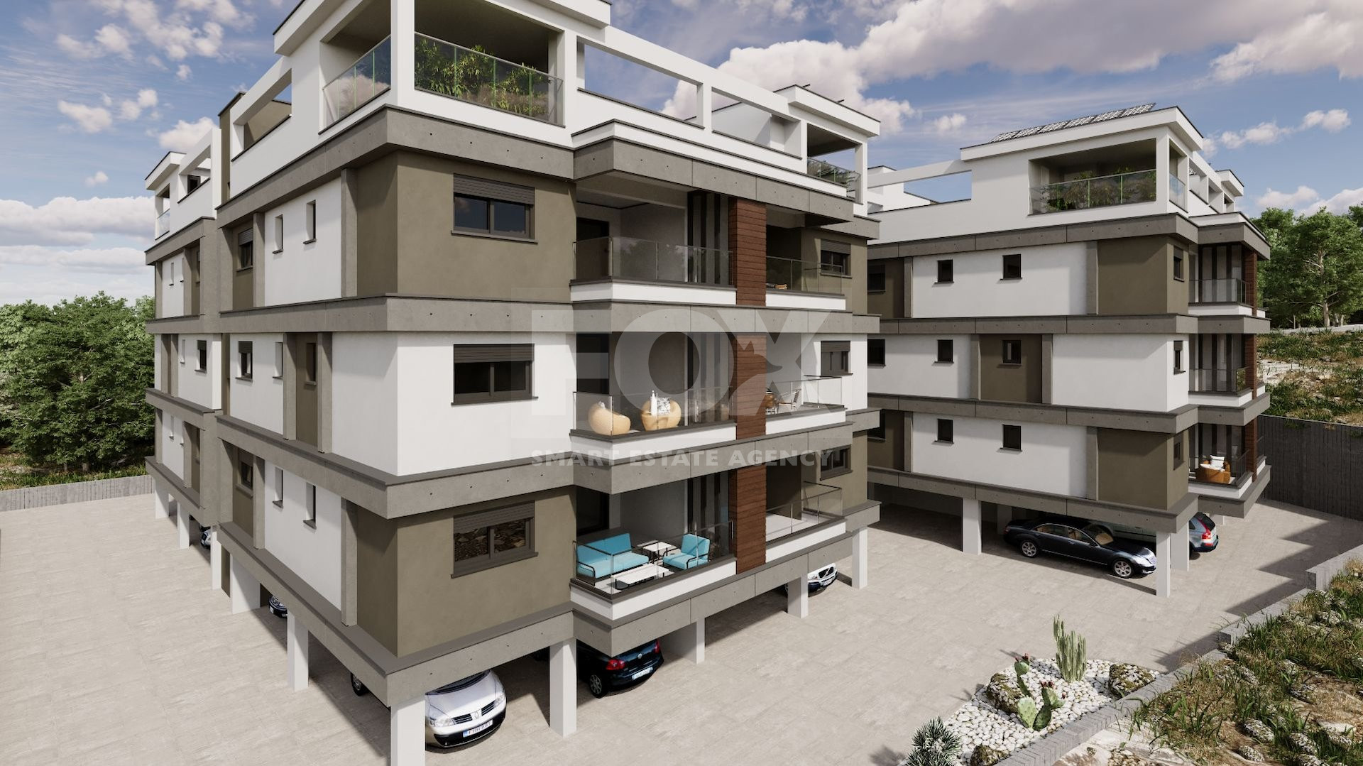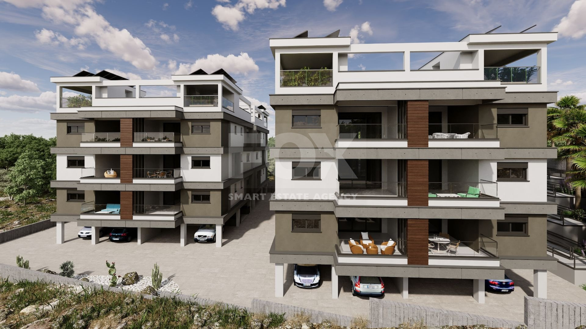 Each apartment in the complex includes a covered parking space and a private storage room. Thoughtful design elements include shutters in the bedrooms, provisions for air conditioning and electric heating, and a photovoltaic system for energy efficiency.