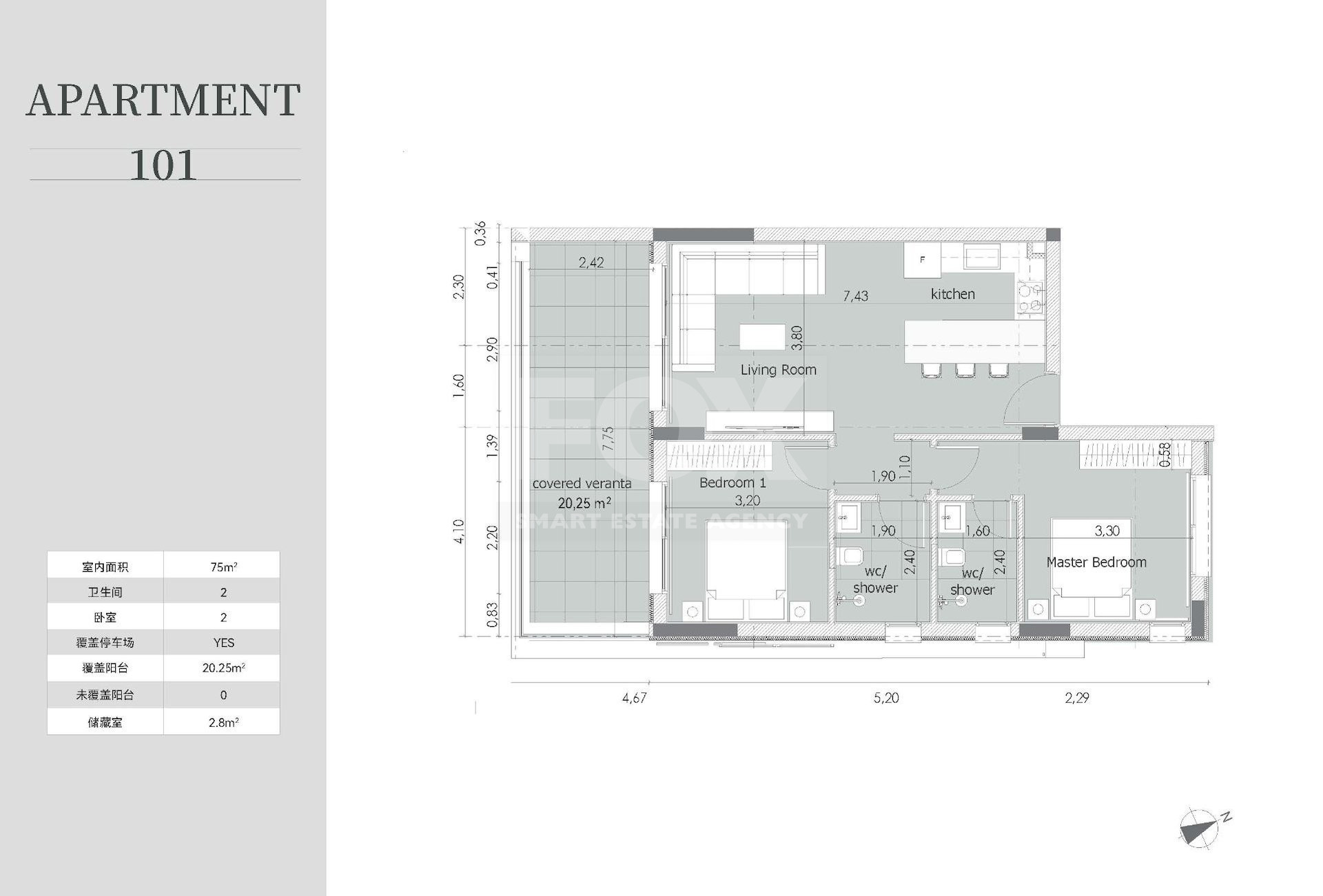 • Total covered area: 75 m²