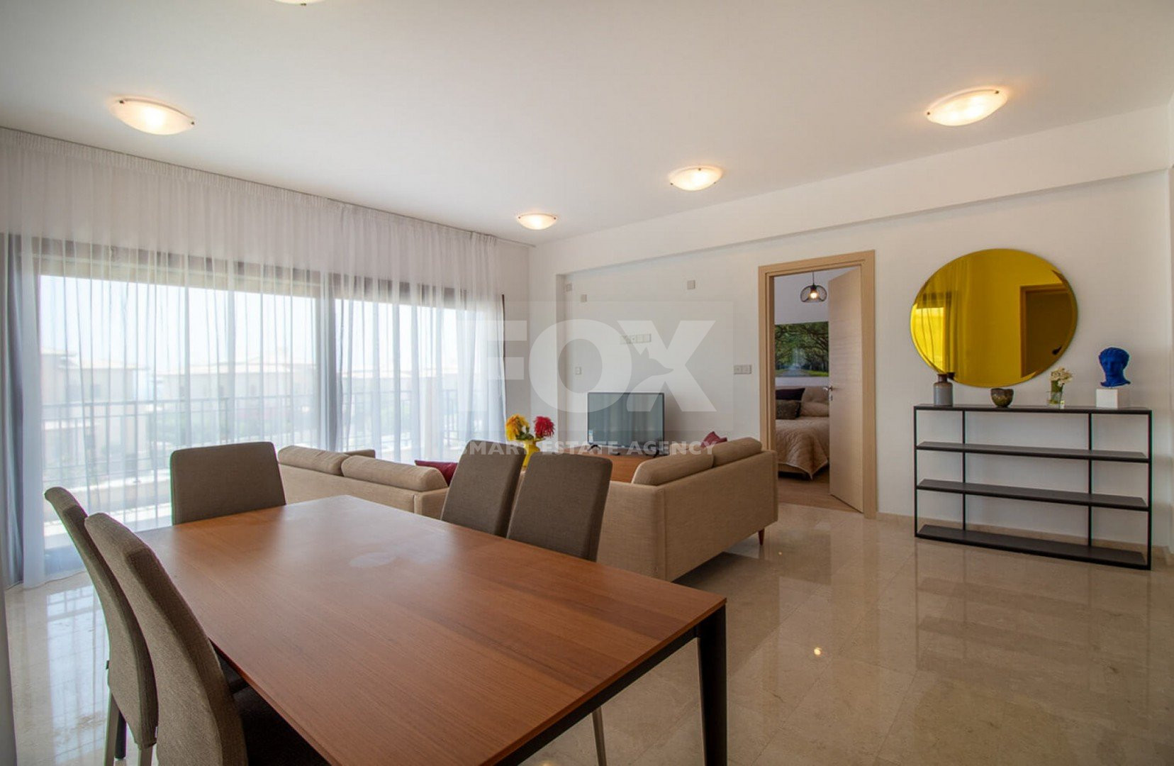 The apartment offers spacious living areas and comes fully equipped with contemporary amenities and brand-new fittings. Crema marble flooring enhances the living, dining, kitchen, and bathroom areas, while the bedrooms feature elegant parquet flooring. The layout includes one en-suite double bedroom and one twin bedroom with an additional bathroom. The property also enjoys lovely views overlooking the communal swimming pool.