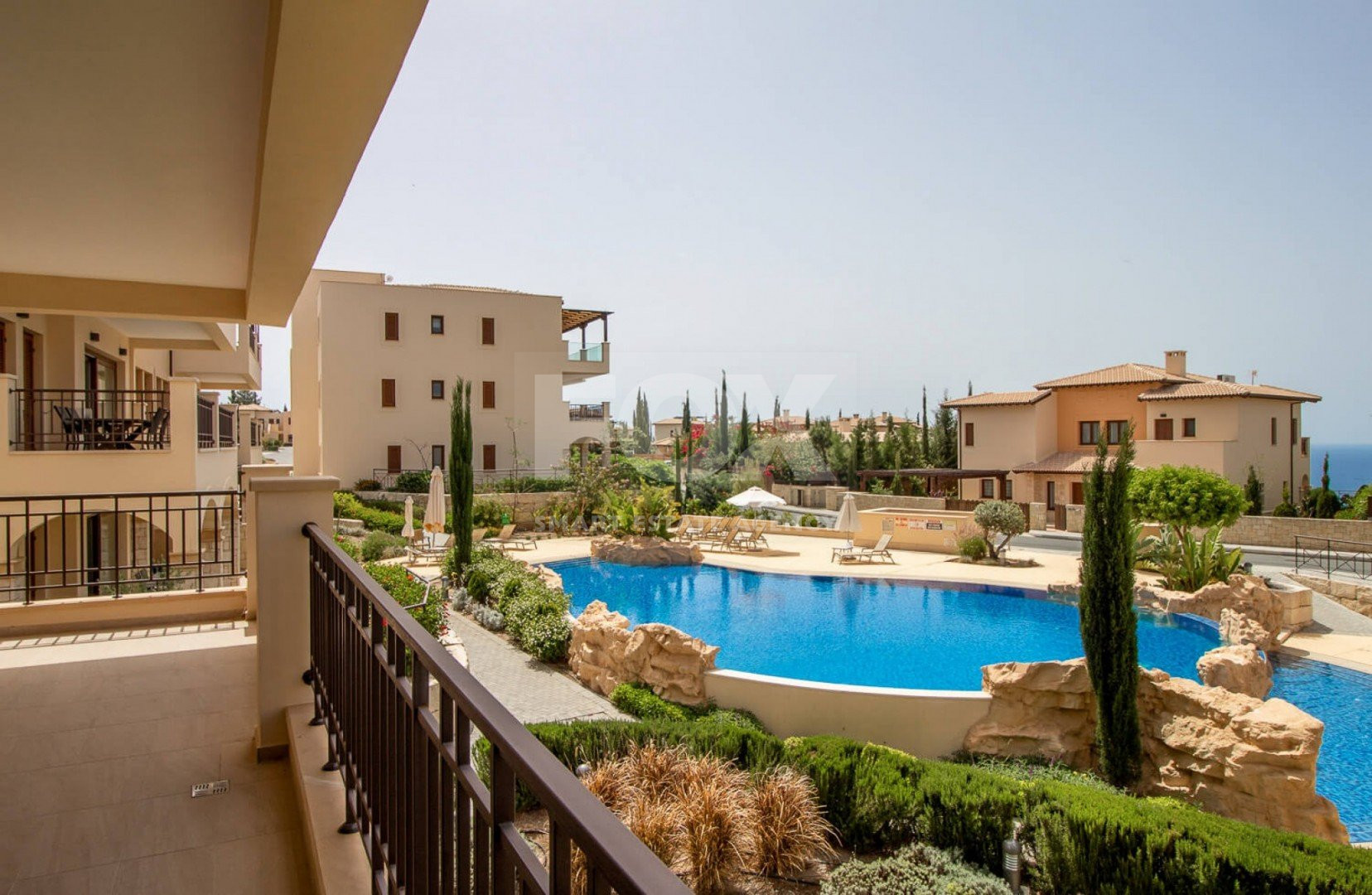 A private balcony overlooking the communal pool