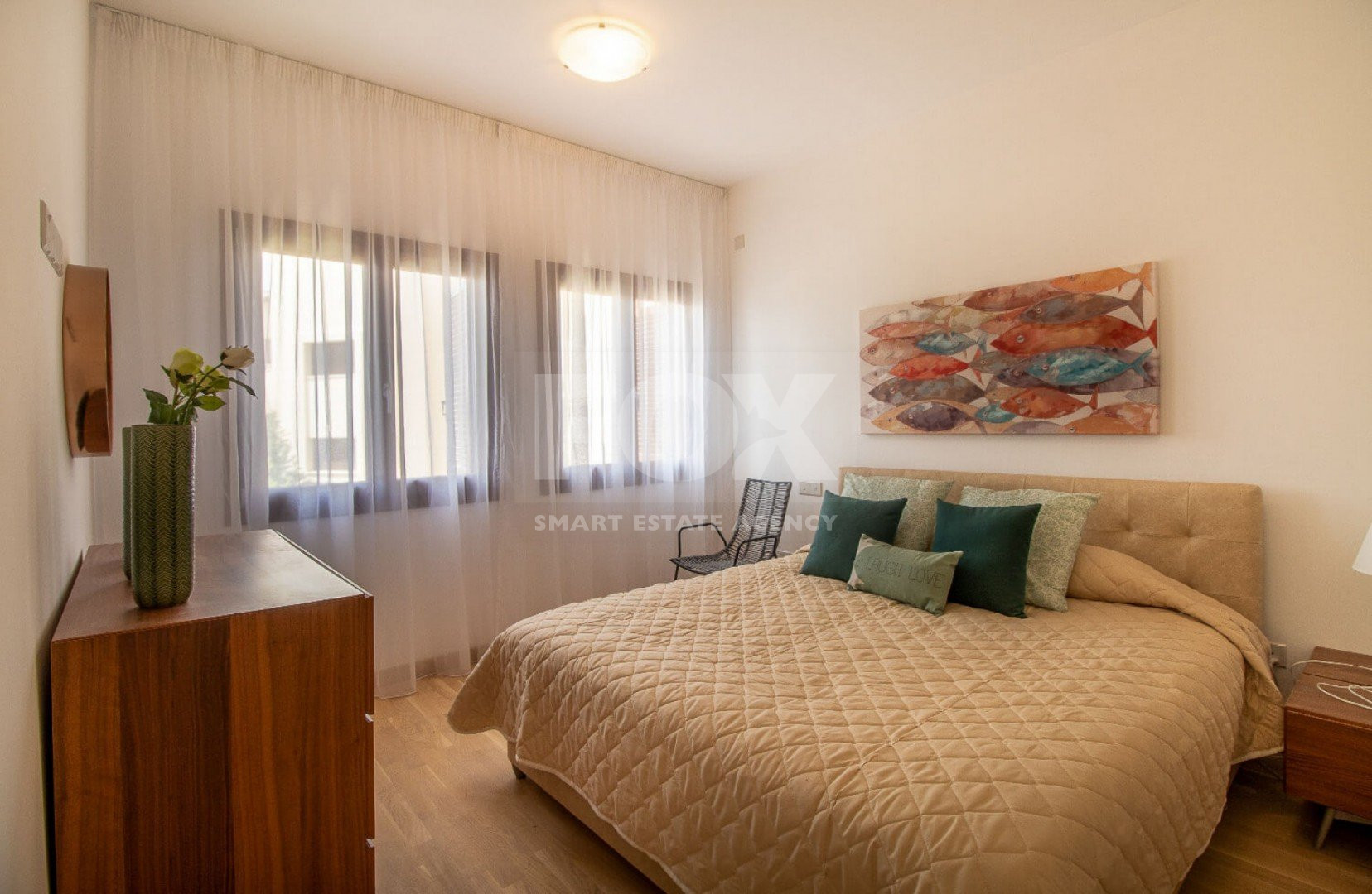 The apartment boasts bright, spacious interiors and is fully equipped with modern amenities and brand-new fixtures. Crema marble flooring enhances the living, dining, kitchen, and bathroom areas, while the bedrooms feature warm parquet flooring for added comfort and style.
