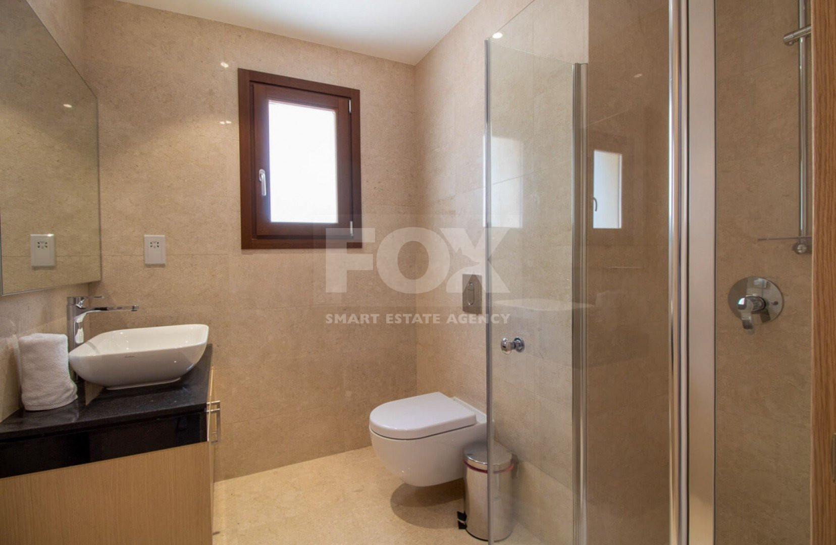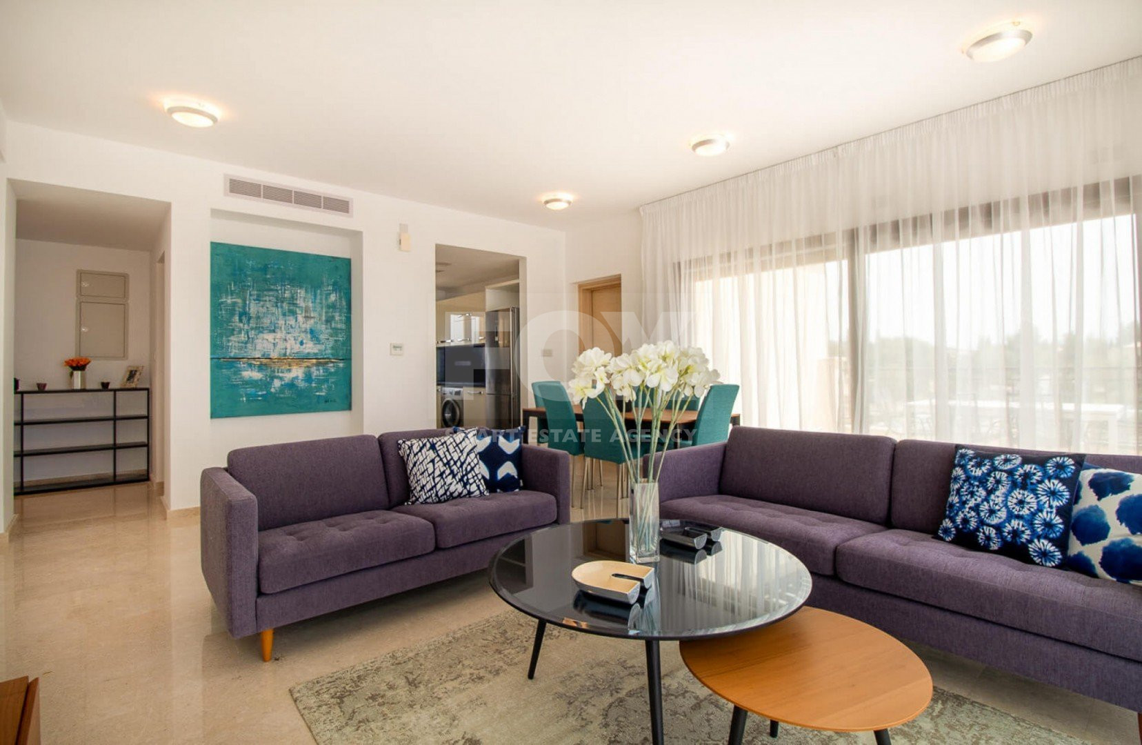 Crema marble flooring is featured in the living, dining, kitchen, and bathroom areas, while the bedrooms have parquet flooring.