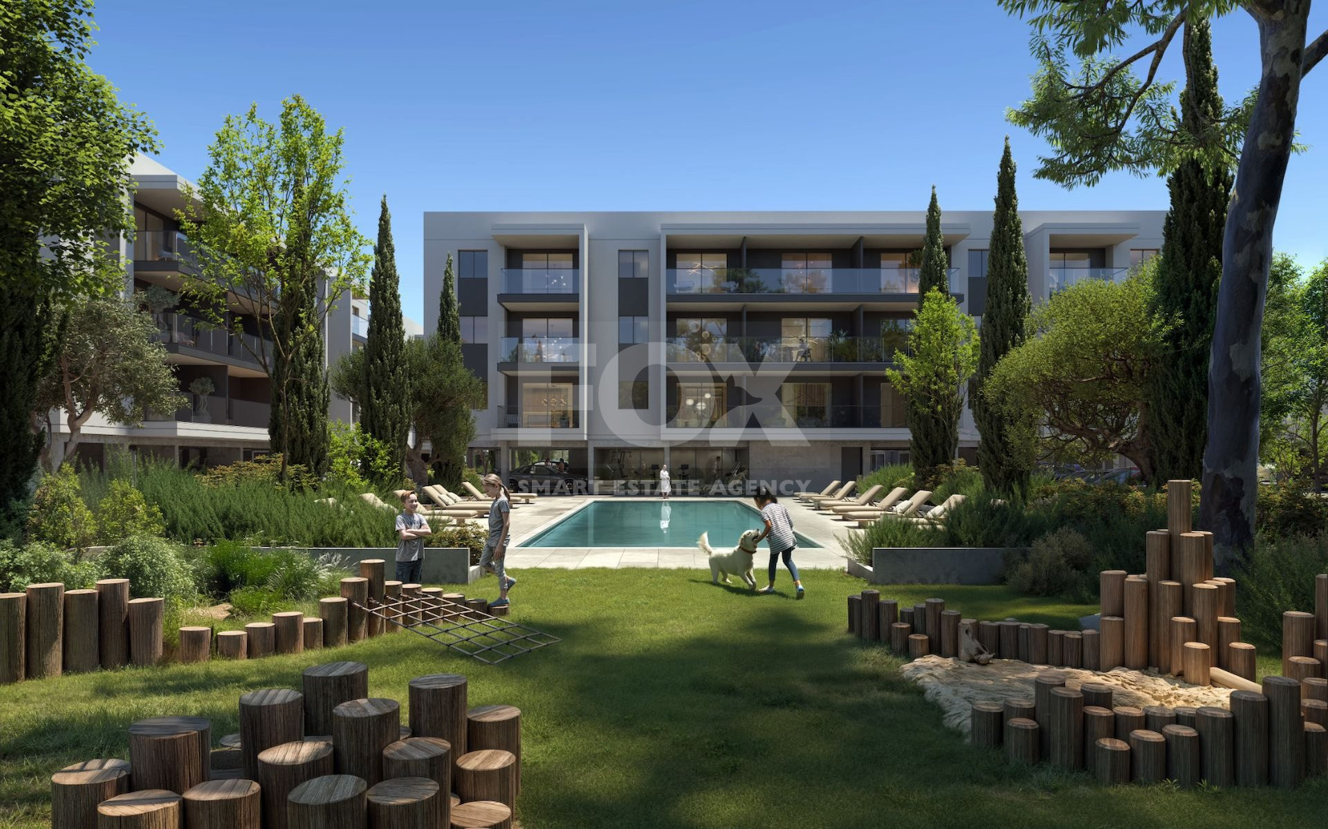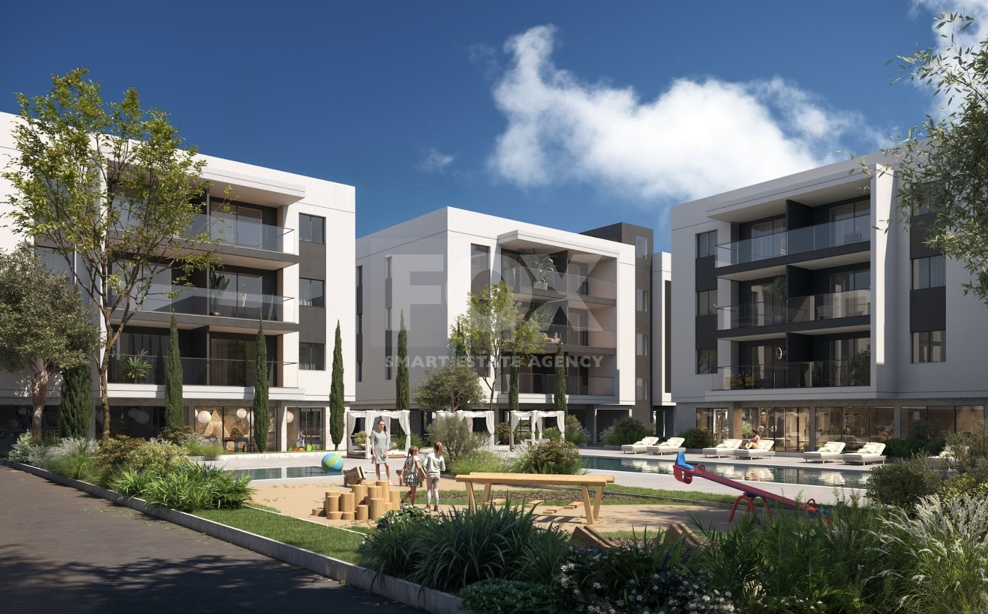 Modern gated community with reception, pools, gyms, saunas, kids’ playgrounds, playroom with a golf simulator and a business lounge;