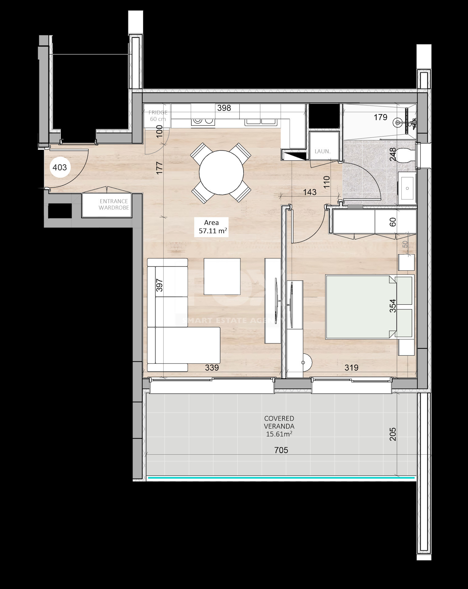 The apartment includes a covered veranda of 15.61 sqm, offering ample outdoor space for relaxation or dining.