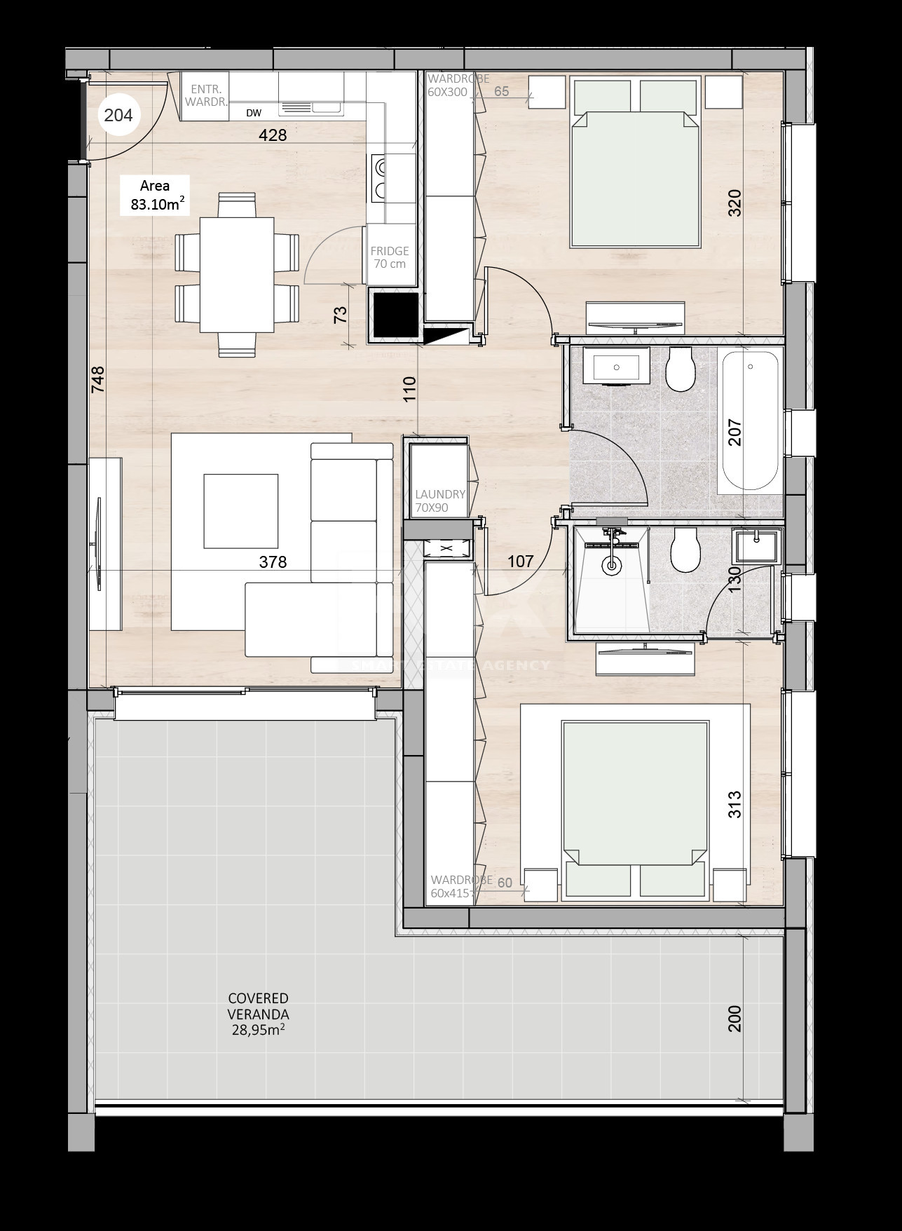 This spacious 2-bedroom apartment boasts a total covered area of 112.05 sqm, offering 83.10 sqm of internal living space, along with a 28.95 sqm covered veranda that is perfect for outdoor relaxation or entertaining. The apartment also includes 6.86 sqm of common area.