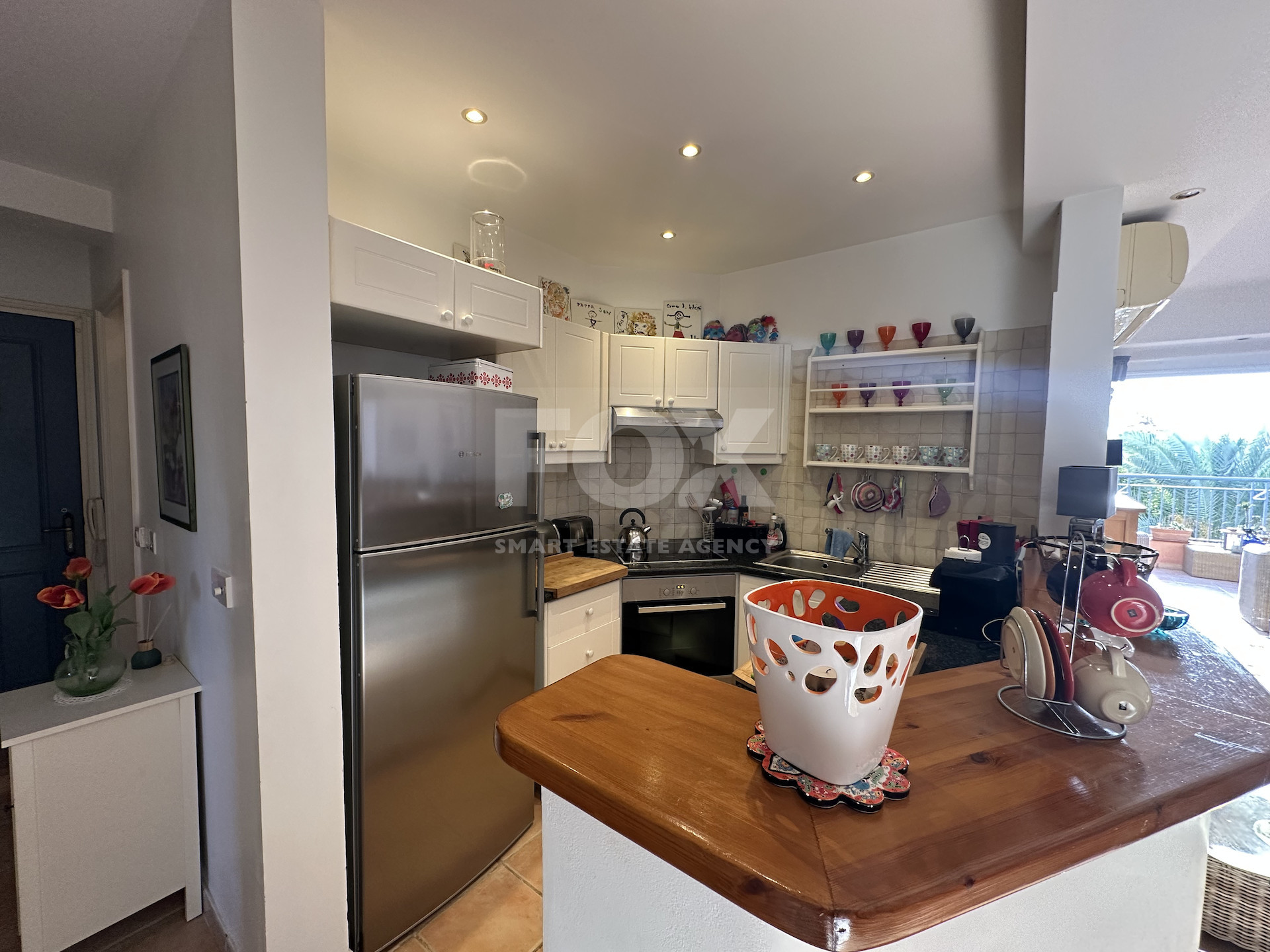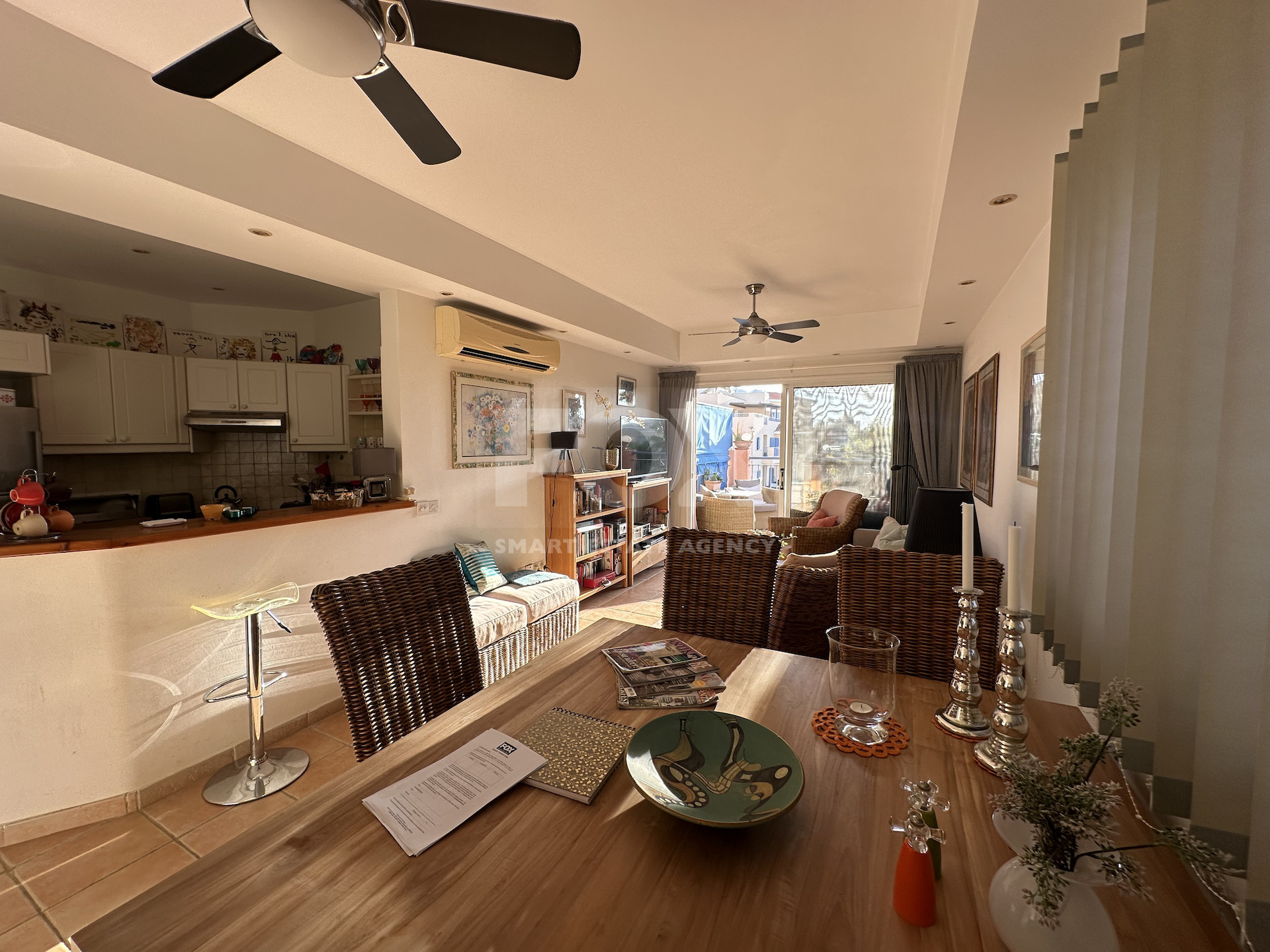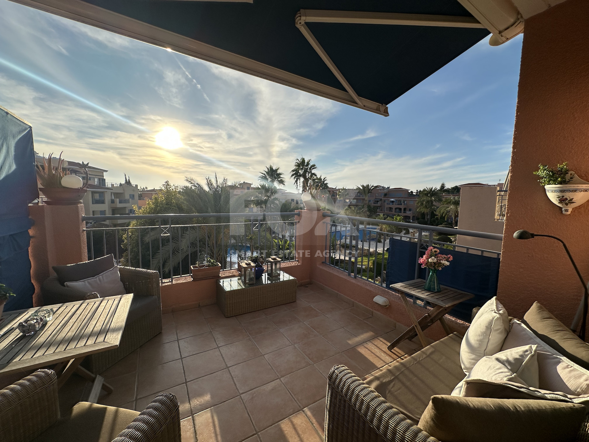 Situated on the 2nd floor, the property benefits from abundant natural light due to its corner positioning. The open-plan living and dining area connects to a fully equipped kitchen and opens onto a covered veranda overlooking the pool and garden courtyard.