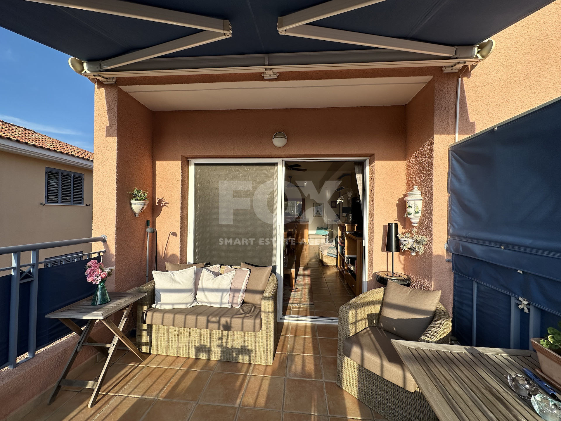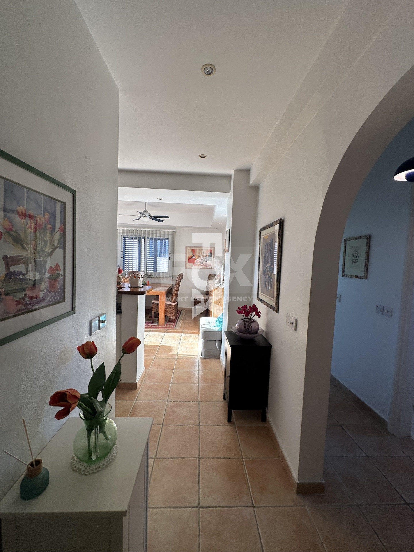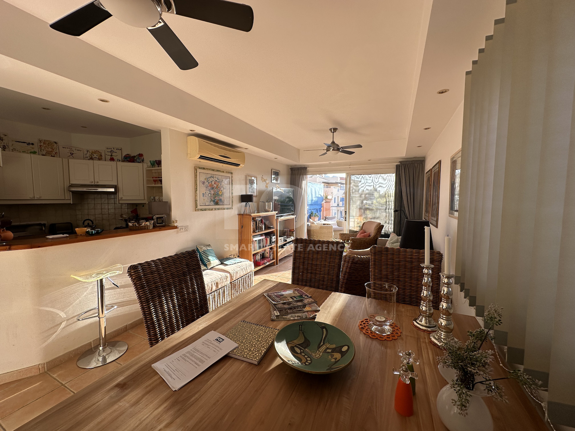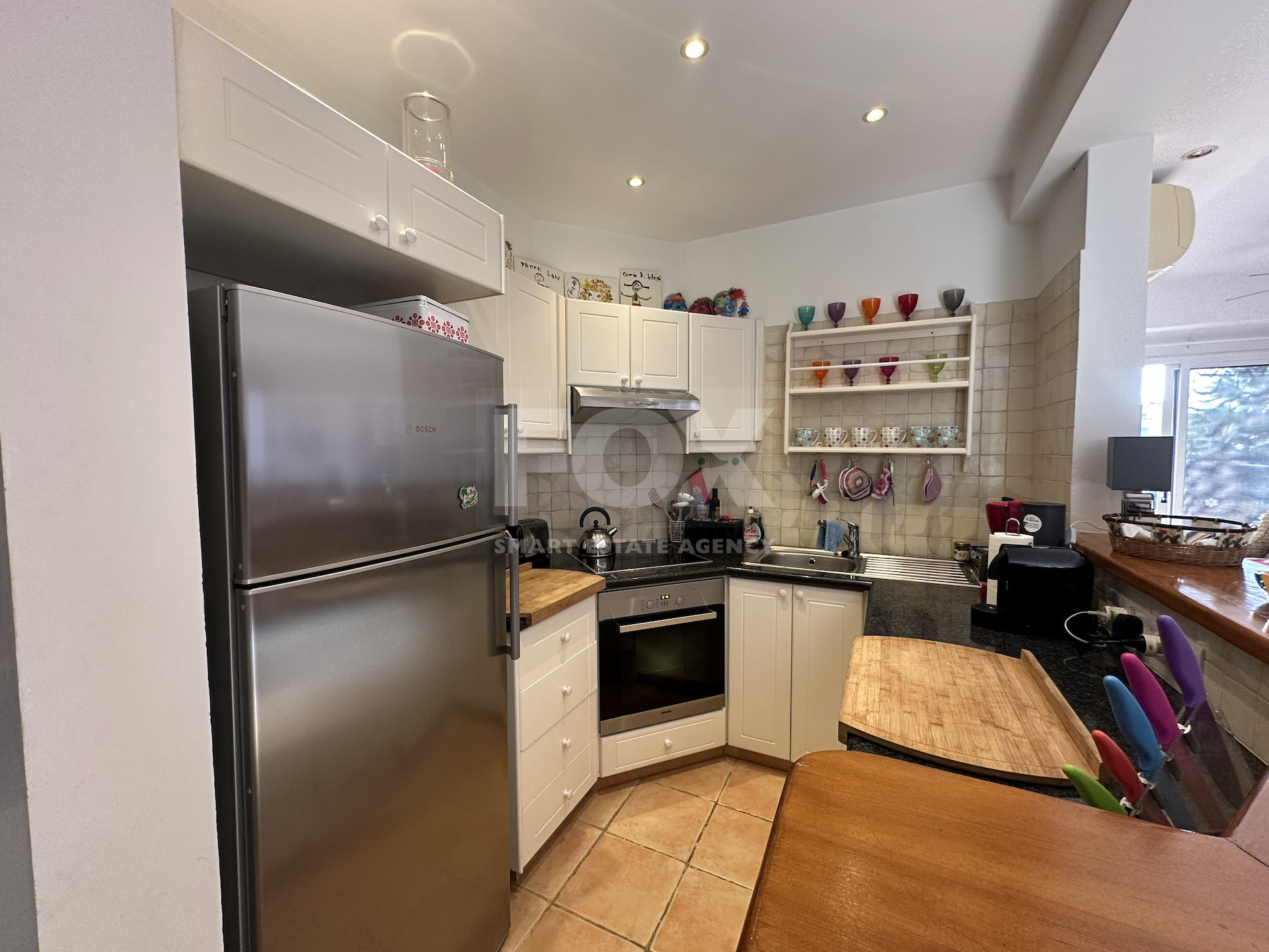 Situated on the 2nd floor, the property benefits from abundant natural light due to its corner positioning. The open-plan living and dining area connects to a fully equipped kitchen and opens onto a covered veranda overlooking the pool and garden courtyard.