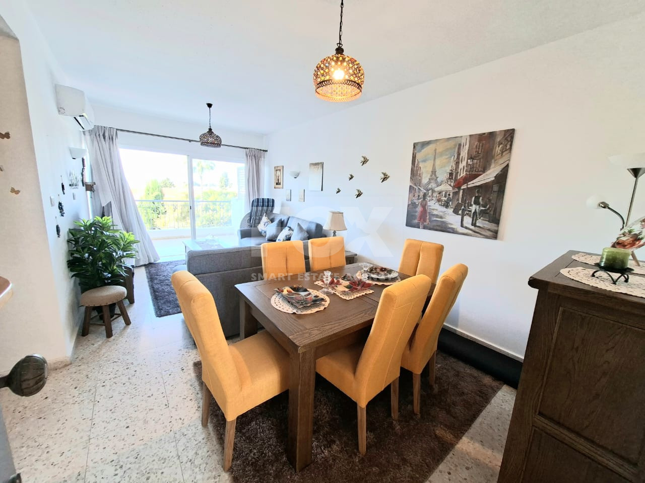 The apartment is fully furnished and offers a bright open-plan living and dining area, a fitted kitchen, and access to a 9 sq.m covered veranda, ideal for outdoor seating and relaxation.
