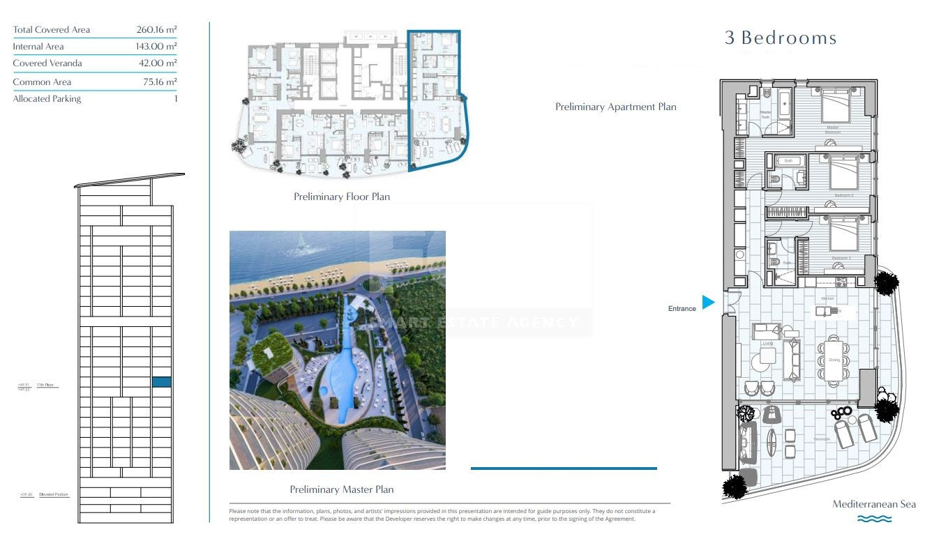 Spanning a generous 260.16 sqm of total covered area, internal area 143sqm, covered veranda 42sqm and common area 75.16sqm the residence offers an open-plan living and dining layout bathed in natural light, flowing seamlessly onto a spacious private terrace overlooking the endless blue of the Mediterranean. It’s the perfect space for relaxing mornings, al fresco dinners, or sunset gatherings with loved ones.