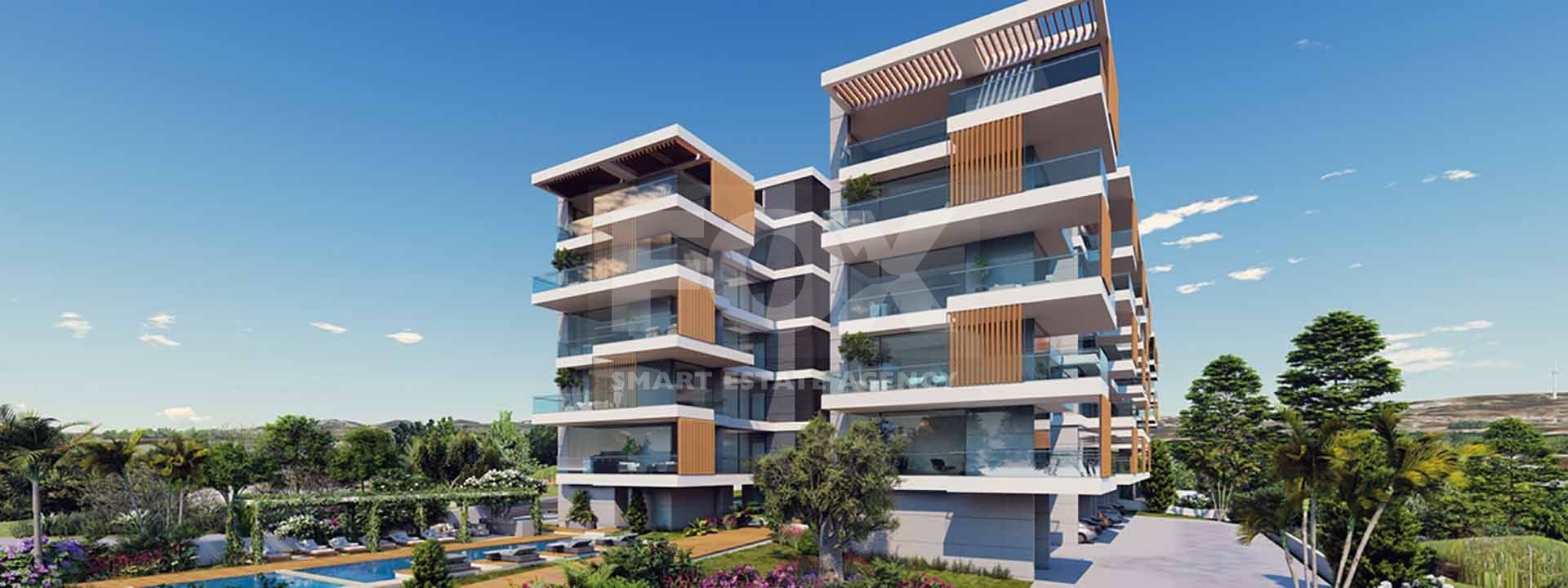 This development offers a selection of 2 and 3-bedroom apartments, most of which feature stunning sea views. Residents can enjoy a range of amenities, including communal swimming pools for each block, solar panels for enhanced energy efficiency, and a contemporary architectural design with sleek lines, large windows, and concrete finishes.