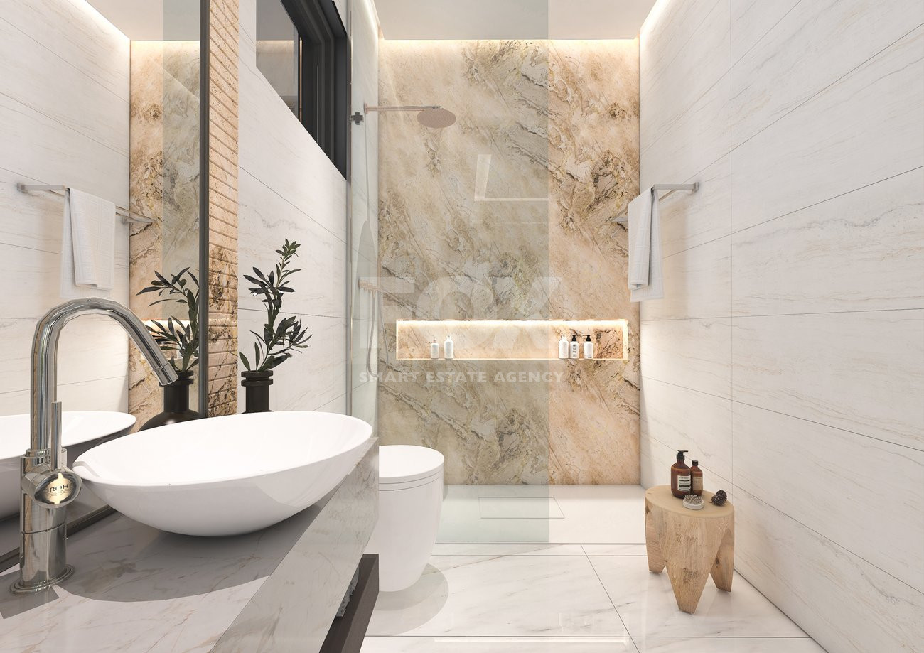 For sale off-plan 3-bedroom apartment in Pafos, on the 2nd floor of a 6-storey building with elevator. Internal space is 111.4 m2, featuring a bright open-plan kitchen and living area, two bathrooms, and large windows opening to a generous balcony. Set within a gated complex with a communal swimming pool, fully equipped gym, and landscaped grounds. Optional furnished.