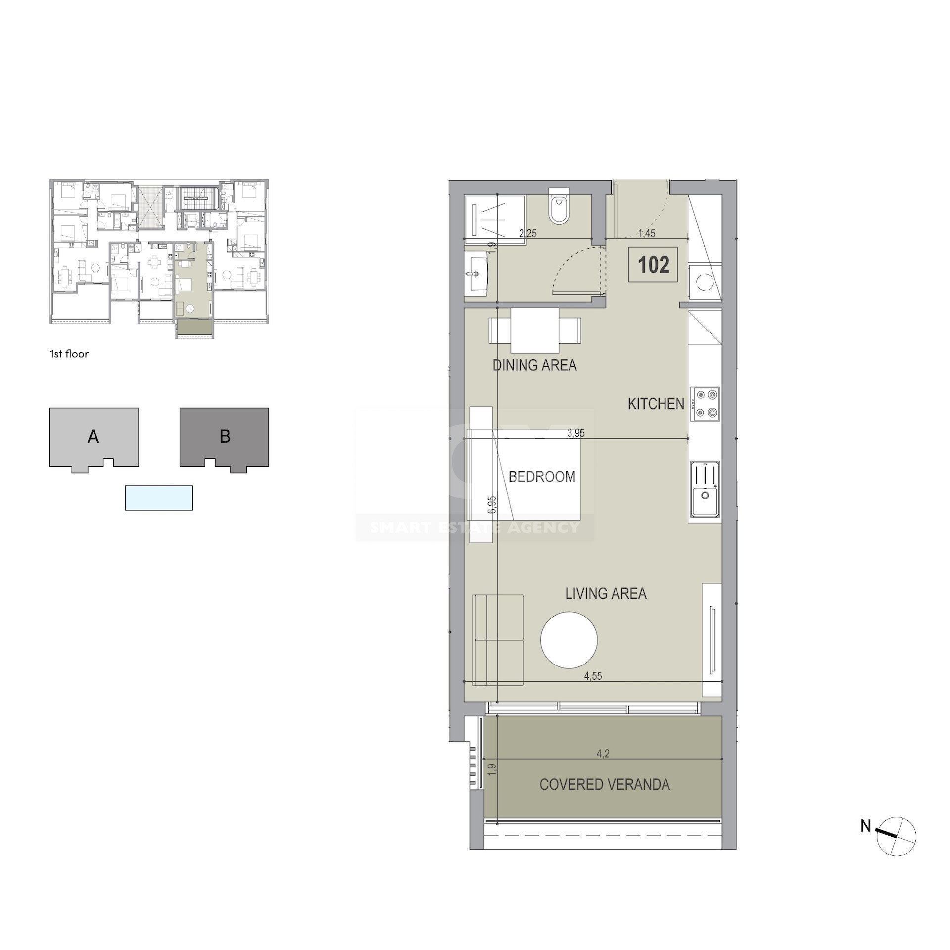 • Total covered area: 45 m²