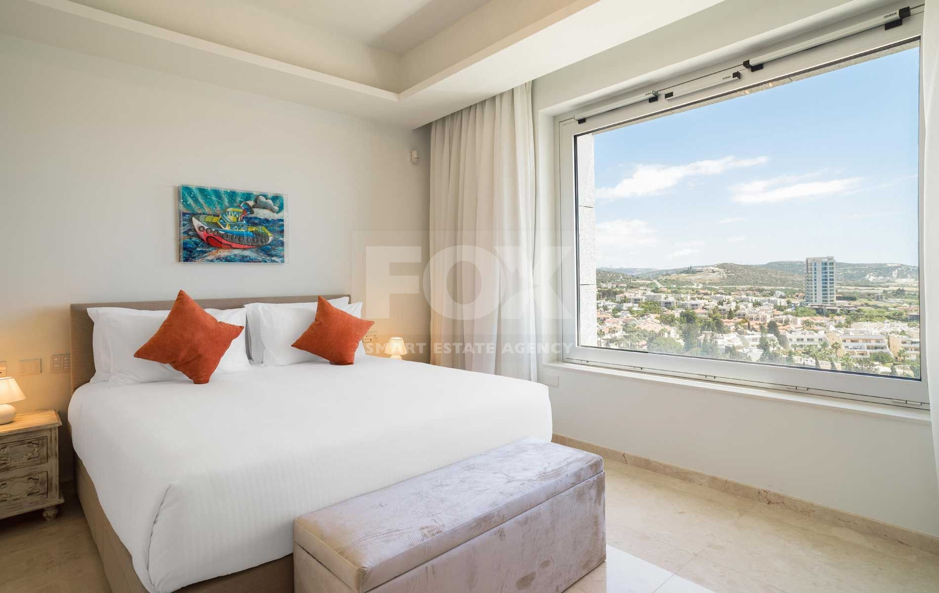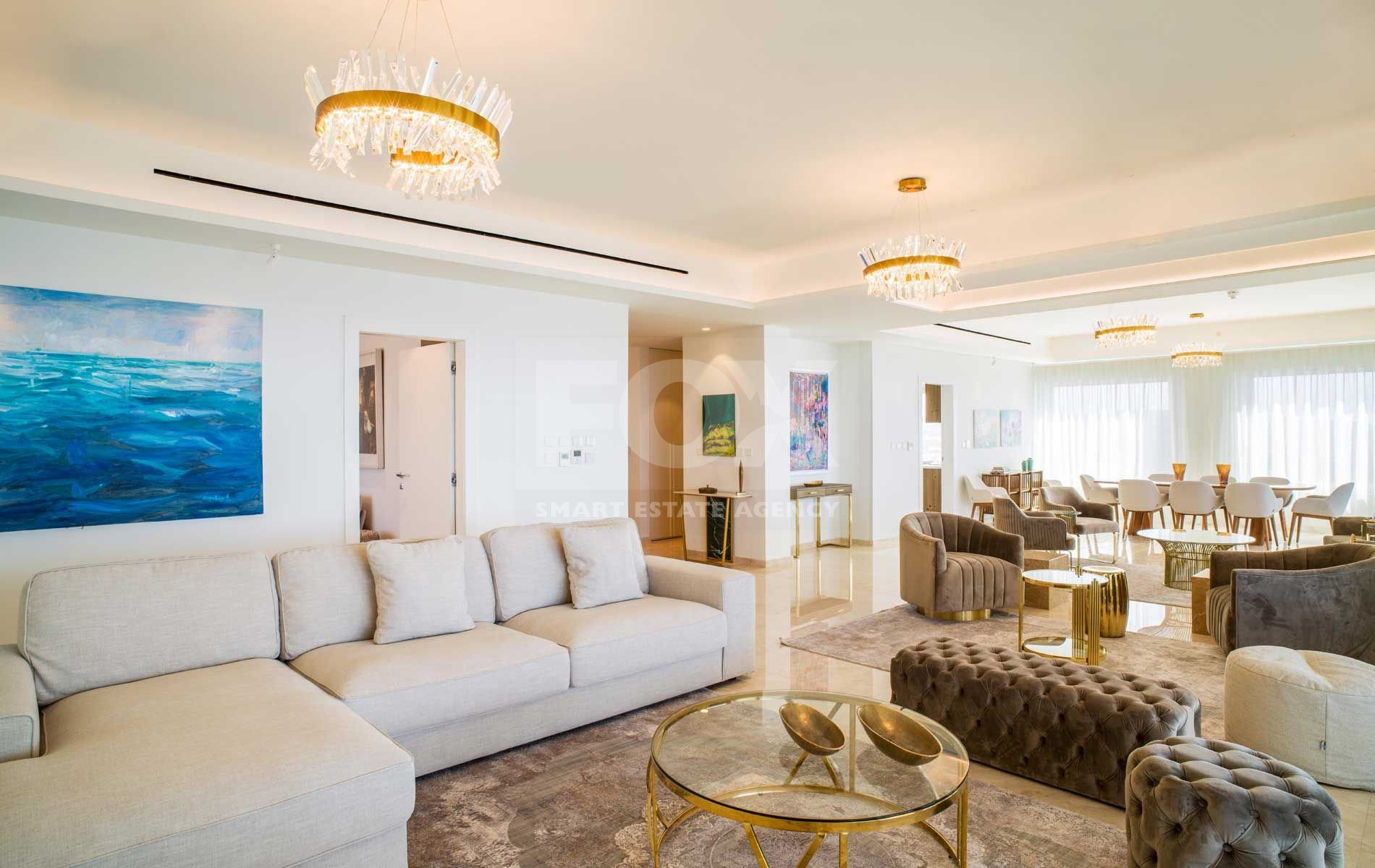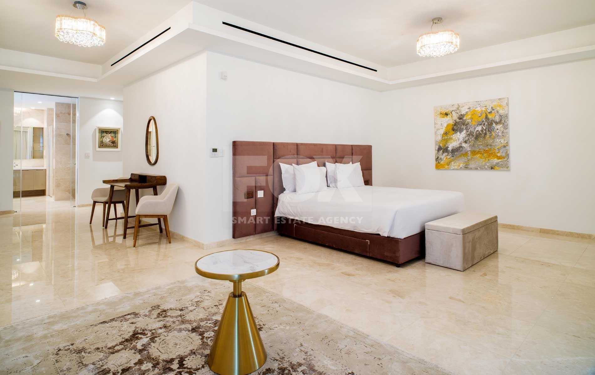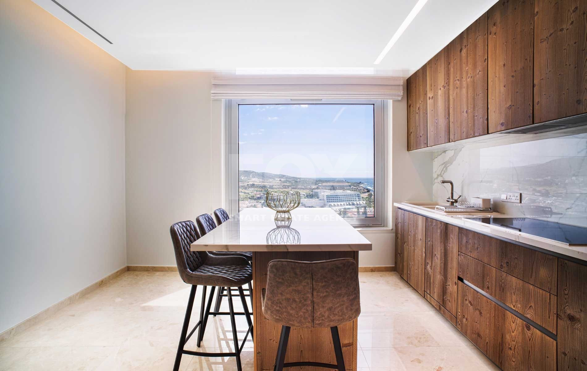 If you are looking for the best Cyprus has to offer, then look no further. This luxurious villa on the top of this amazing residence is a two-storey penthouse on the 11th and 12th floors (level 13 and 14). The twelfth and highest floor boosts the most magnificent views in Limassol, overlooking the private marina, gardens and simply the whole Limassol Bay with unobstructed and unrivalled views. The penthouse has every top-quality finish, with Crema Marfil stunning marble, top Italian brushed gold and wooden tailor-made kitchen, an office and four large bedrooms, all with ensuite. The kitchen has its own service entrance, a must for entertaining and there is a large, covered terrace on the 12th floor. The bedrooms are all situated on the 11th floor and there is a beautiful sweeping staircase connecting the two levels. All amenities have been considered in this state-of-the-art penthouse and every smart home option has been incorporated. There is a large walk in wardrobe in the master bedroom and breath-taking views can be enjoyed from the freestanding Villery & Boch bathtub.