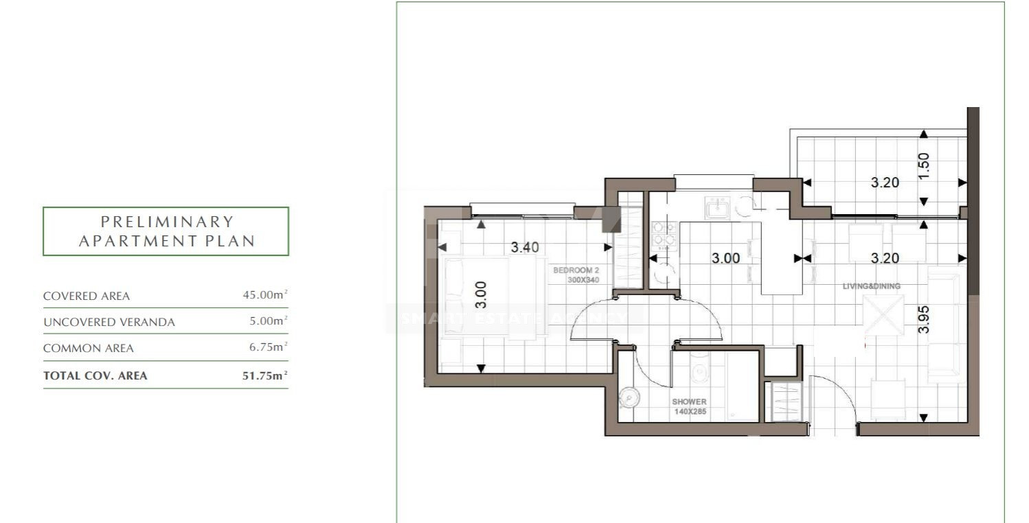 Total Covered Area: 51.75 m²