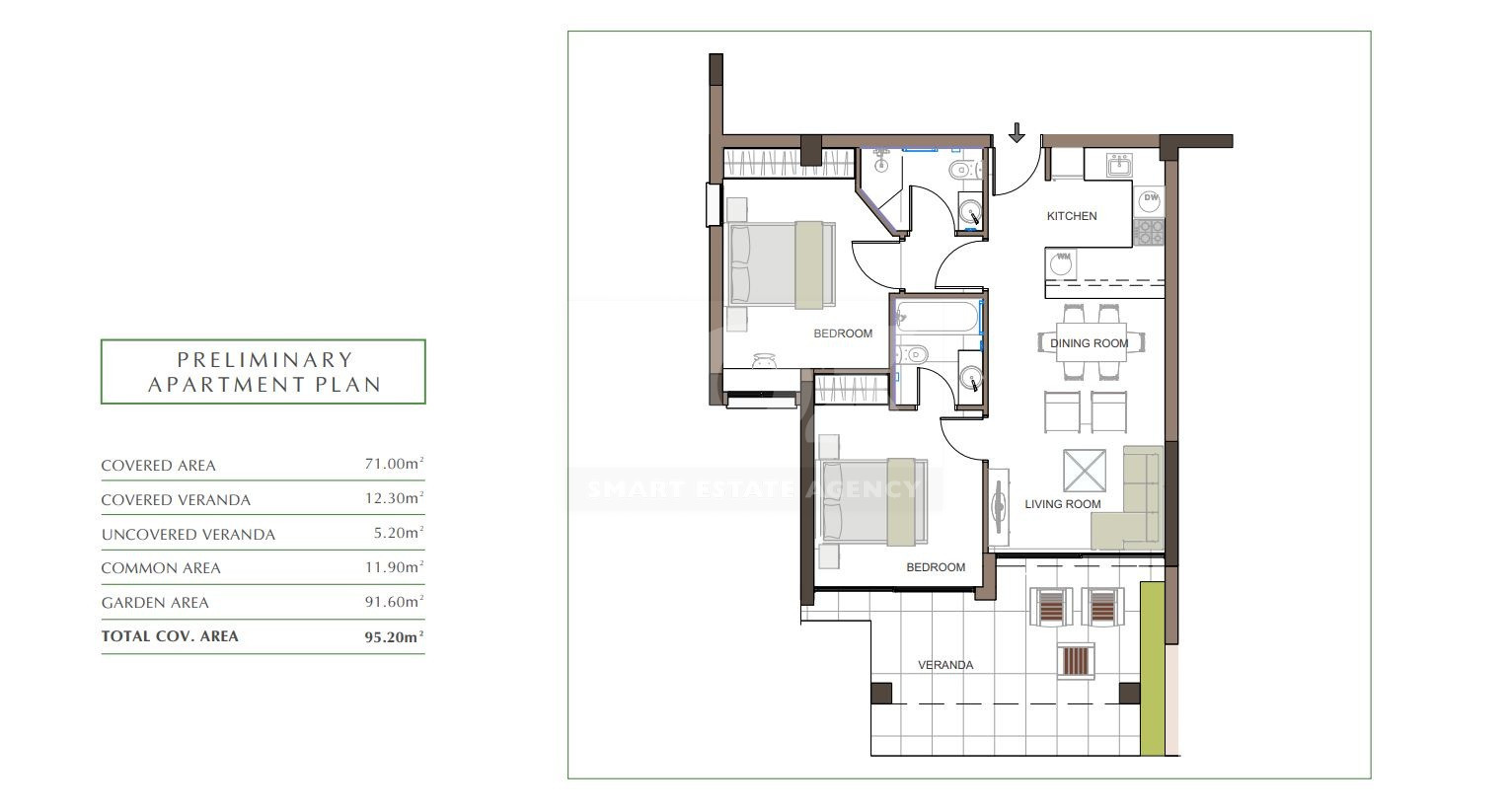 This spacious apartment offers a thoughtfully designed layout, providing ample space for comfortable living. The open-plan living and dining areas are perfect for entertaining, while the large verandas offer stunning views of the surrounding green fields.