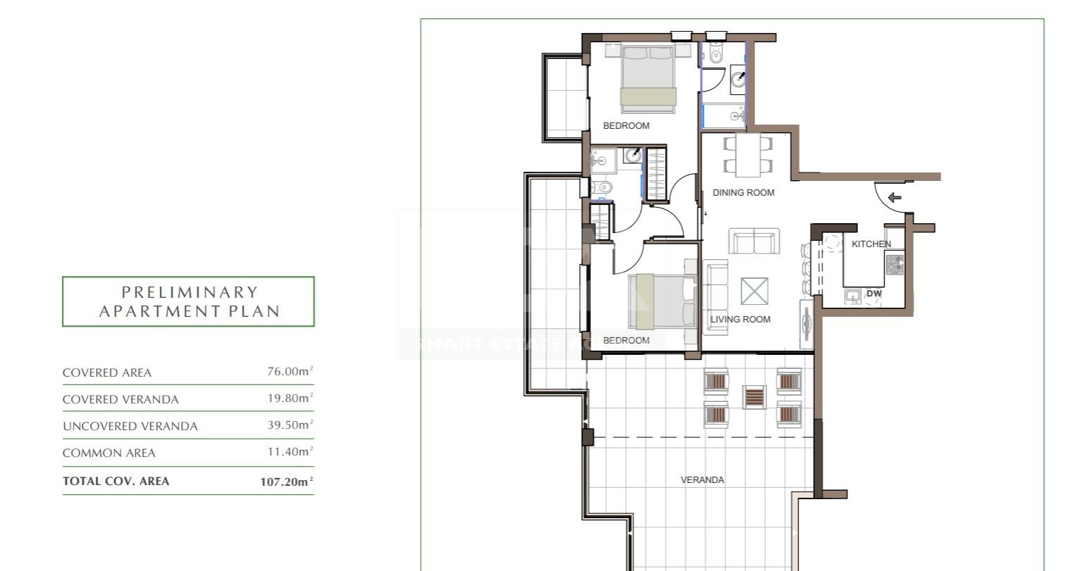 This spacious apartment offers a thoughtfully designed layout, providing ample space for comfortable living. The open-plan living and dining areas are perfect for entertaining, while the large verandas offer stunning views of the surrounding green fields.