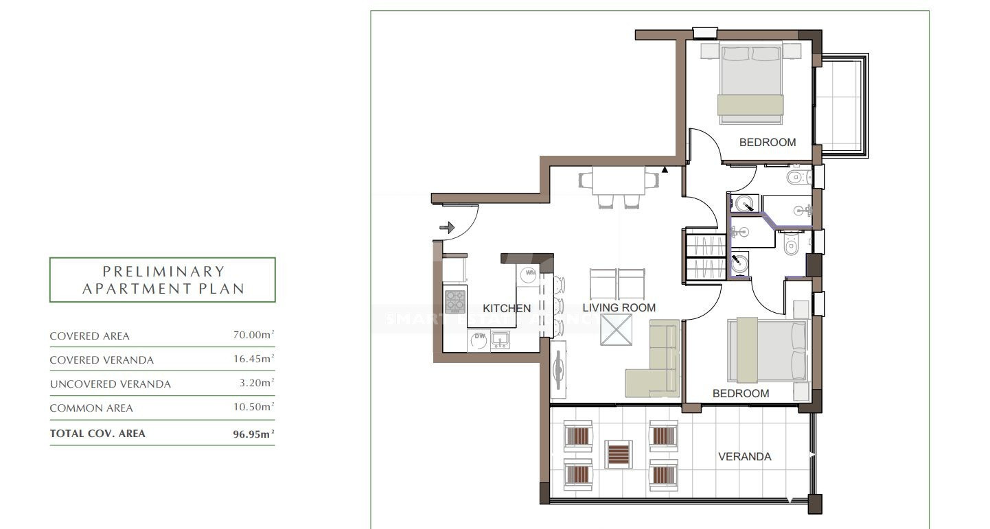 This spacious apartment offers a thoughtfully designed layout, providing ample space for comfortable living. The open-plan living and dining areas are perfect for entertaining, while the large verandas offer stunning views of the surrounding green fields.