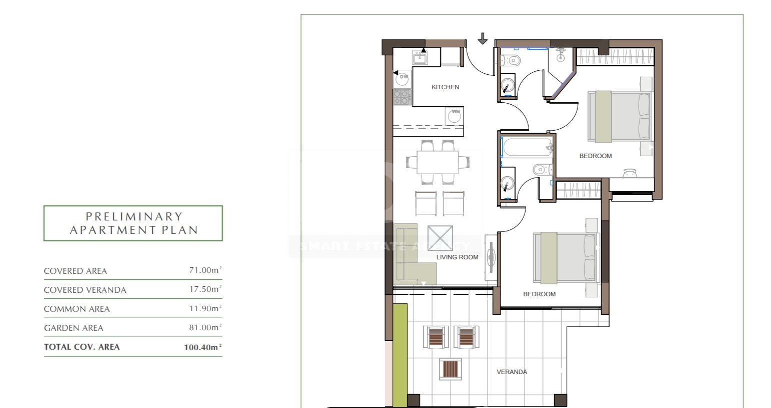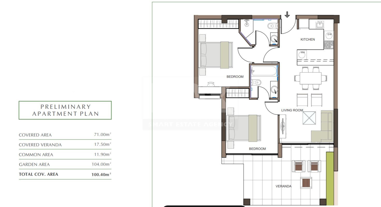 This spacious apartment offers a thoughtfully designed layout, providing ample space for comfortable living. The open-plan living and dining areas are perfect for entertaining, while the large verandas offer stunning views of the surrounding green fields.