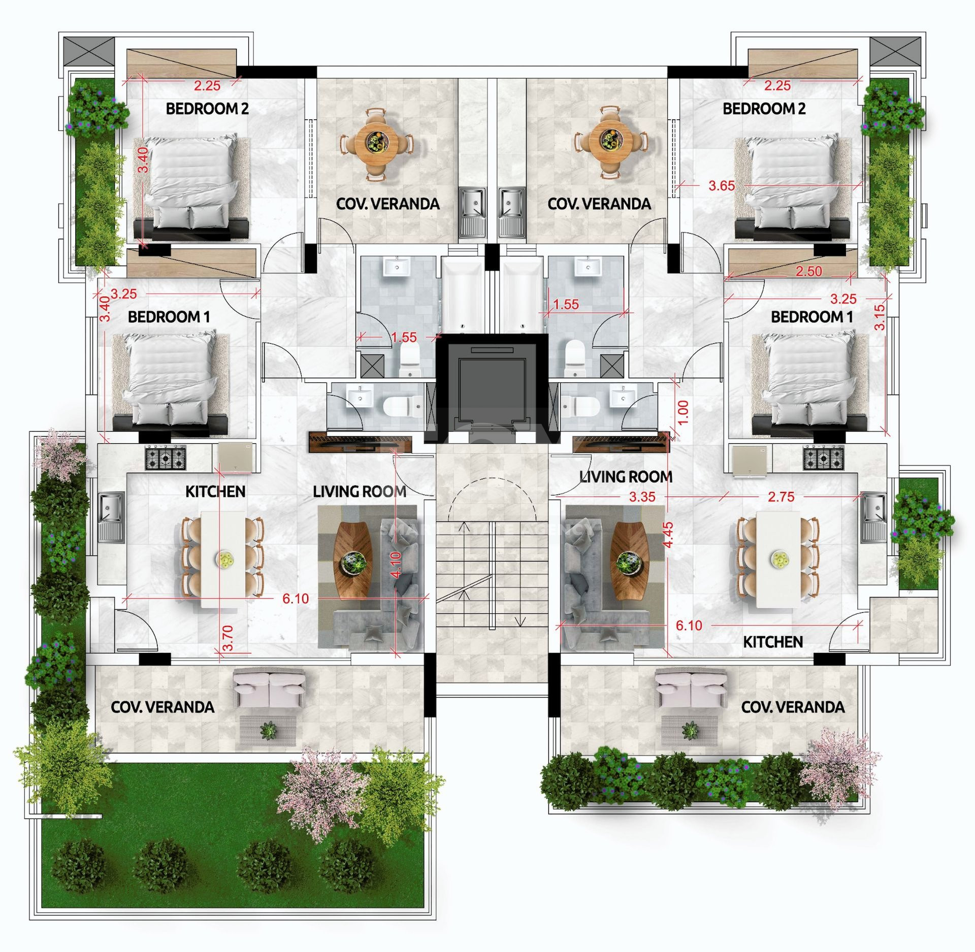 Situated on the first floor of a three-storey building, this stunning apartment features an internal area of 78 square meters, a 22 square meter covered veranda, and its own garden, as shown in the plans. The apartment includes an open-plan kitchen, a living room and dining area, a guest WC, a main bathroom, and two spacious bedrooms. In addition to the front veranda, there is also a nice veranda at the back, which could easily be converted into an extra room in the future.