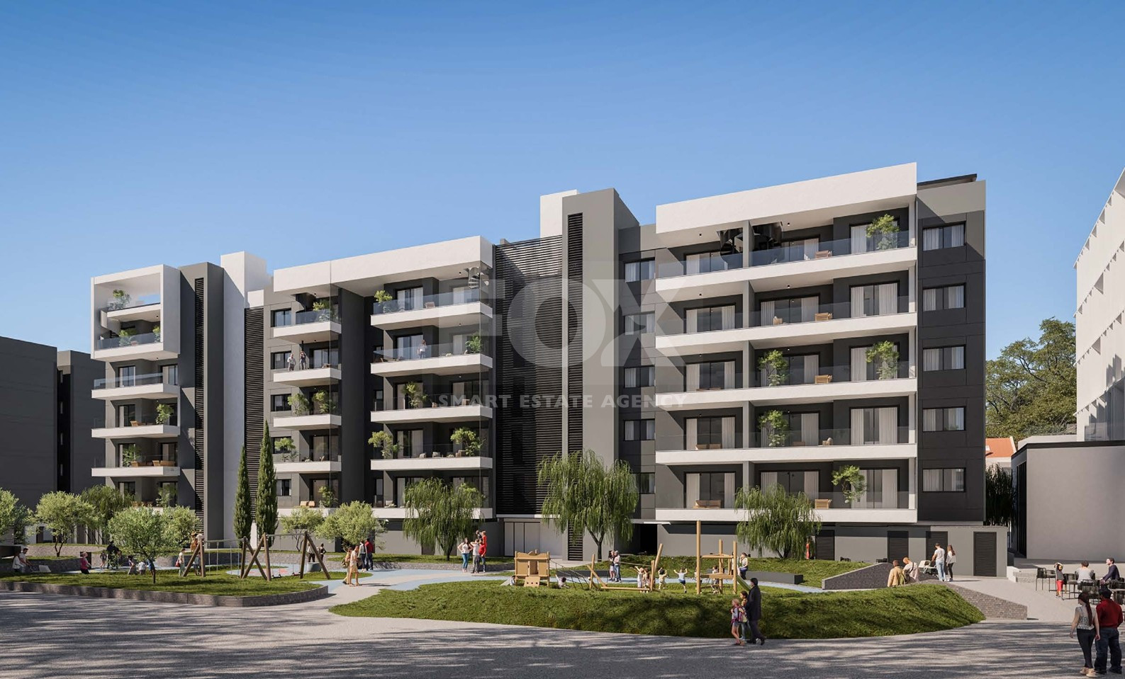 The apartment features a bright open-plan living and dining area extending onto a spacious covered veranda, while the private 100 sqm roof garden offers panoramic open-air living with endless design potential — from lounge and BBQ area to jacuzzi or pergola installation (subject to specifications).