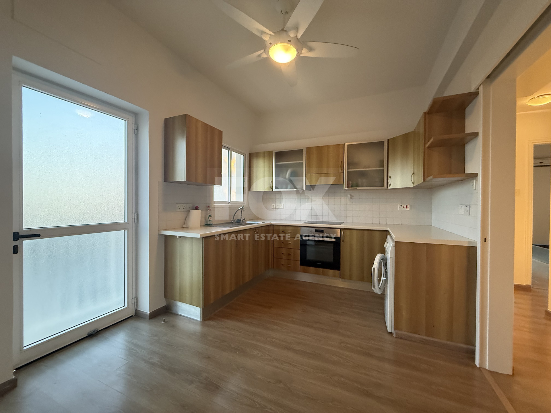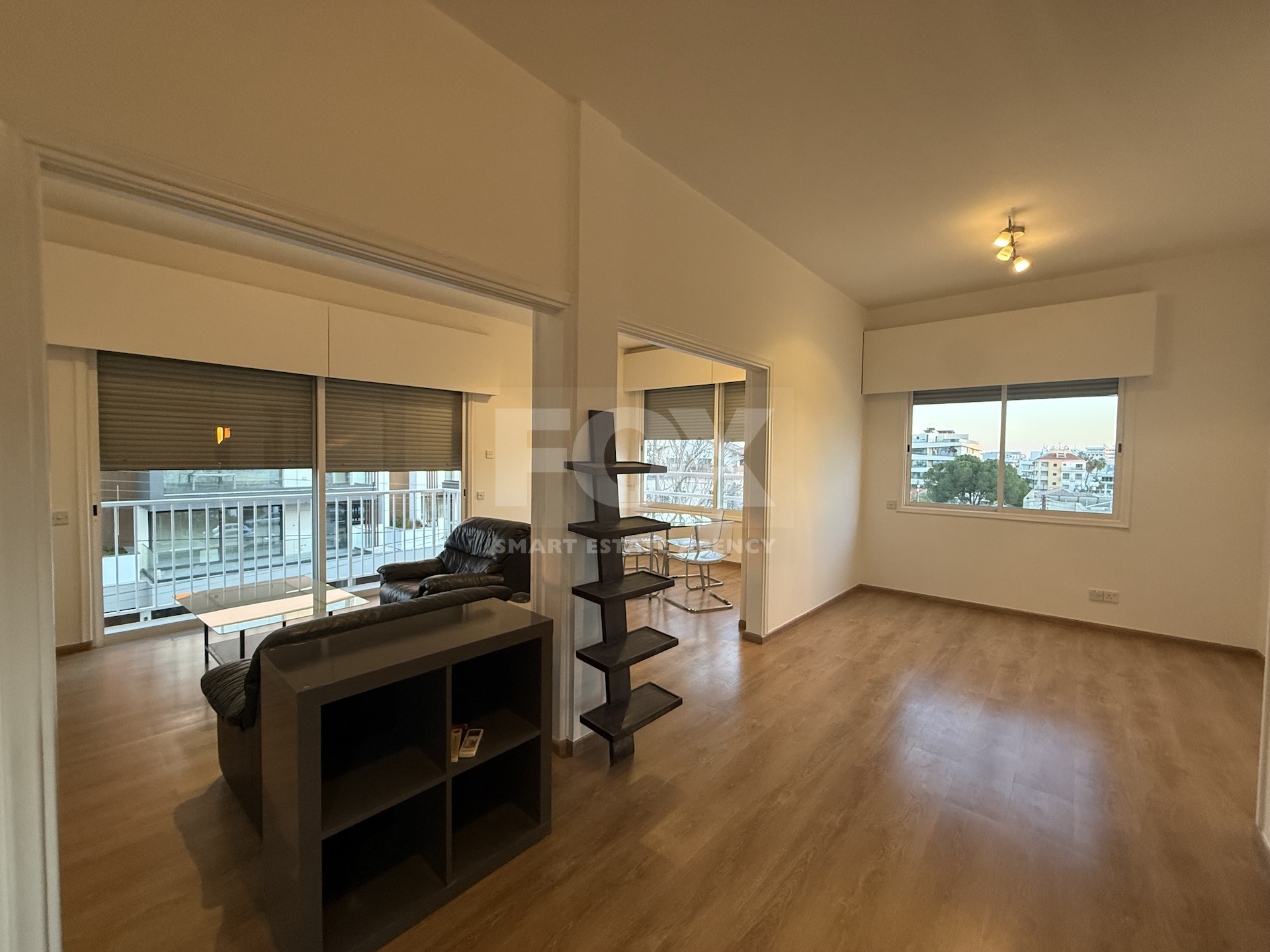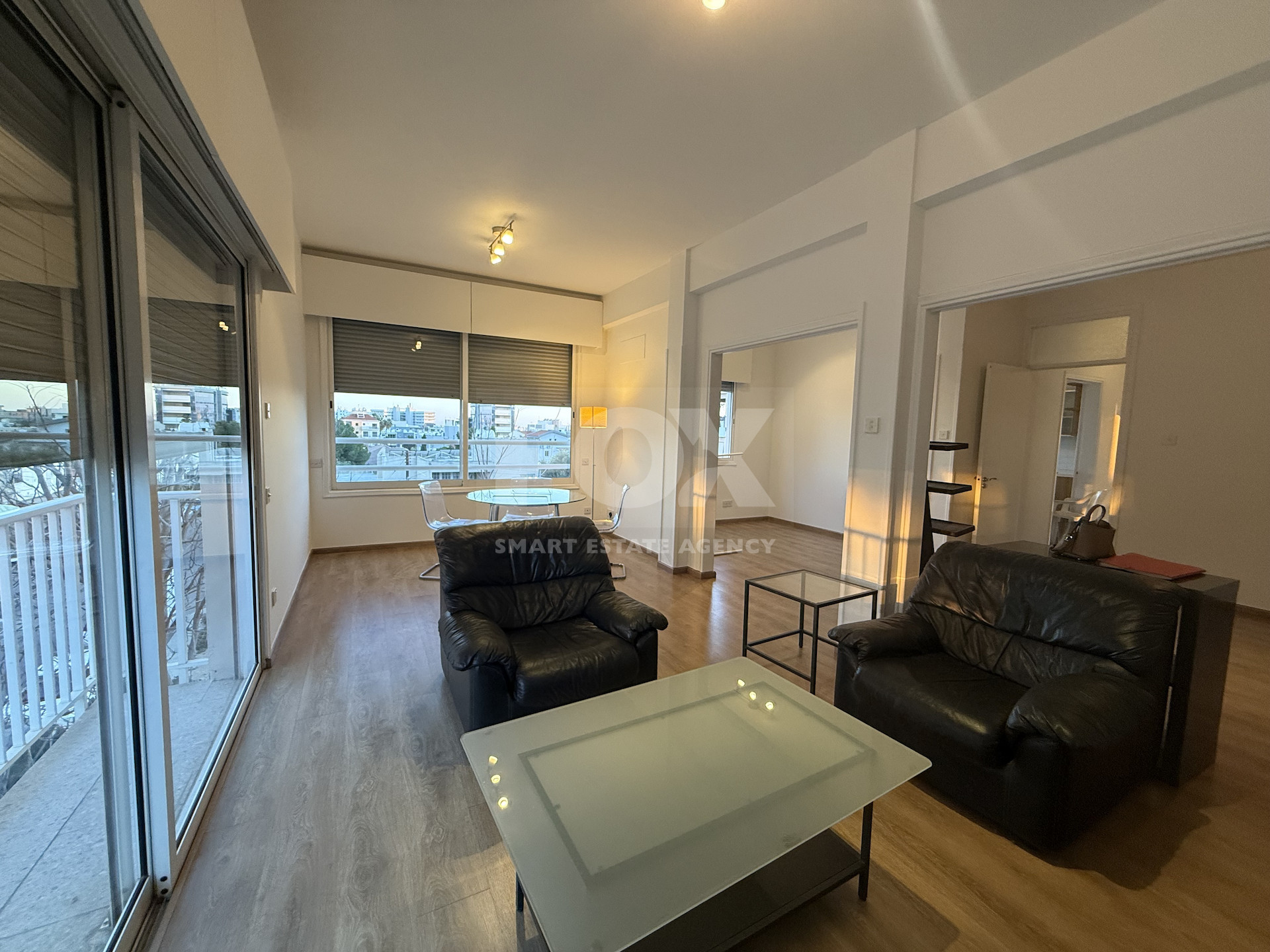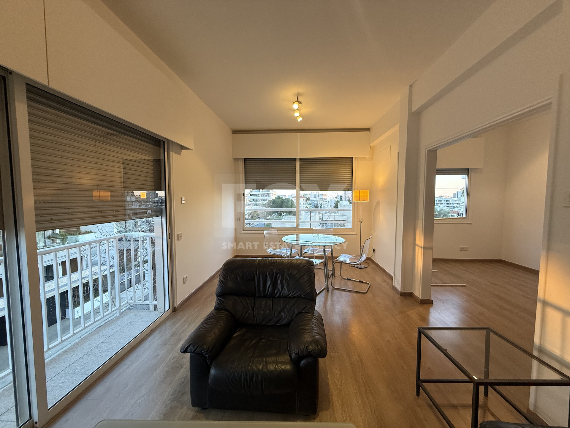 The apartment is in excellent condition, featuring laminate parquet flooring throughout and large windows that bathe the space in natural light, creating a bright and airy atmosphere. Electric shutters provide convenience and added security.