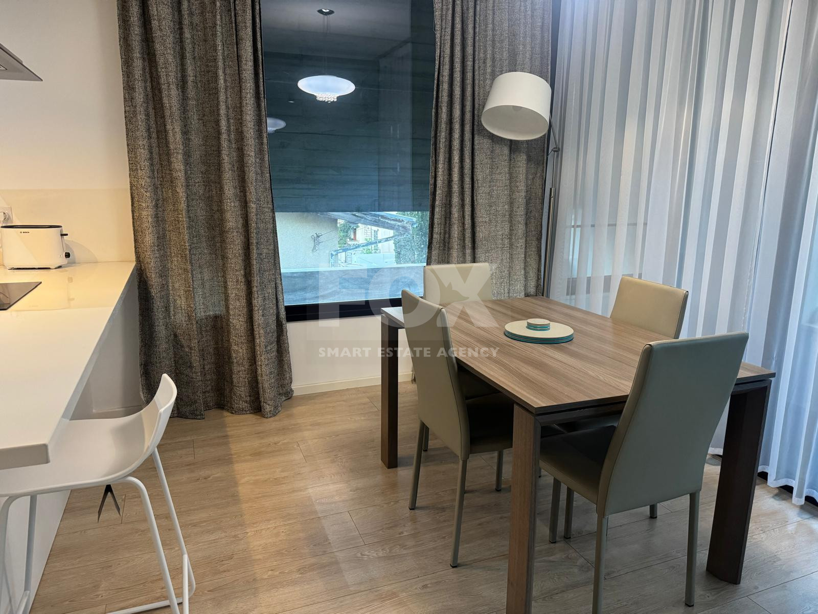 The apartment features a thoughtfully designed open-plan layout, combining a stylish kitchen, dining, and living area that flows seamlessly onto a beautifully furnished balcony—ideal for relaxing or entertaining. The kitchen is fully equipped with high-end electrical appliances, including a dishwasher, washing machine, and fridge freezer, complemented by a sleek island bar.