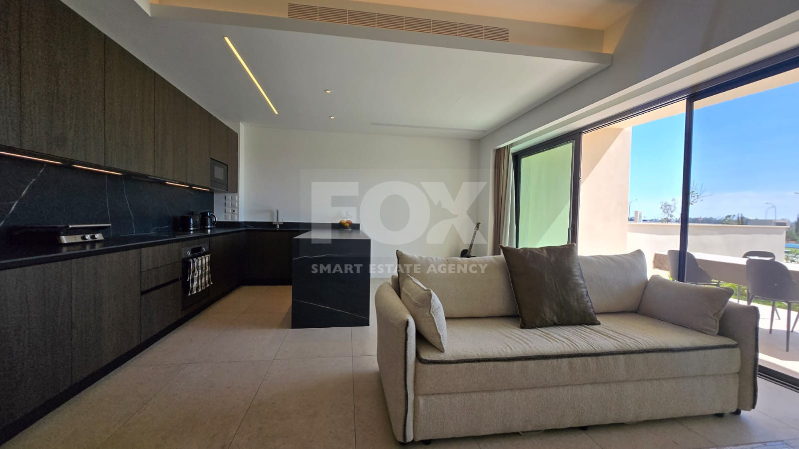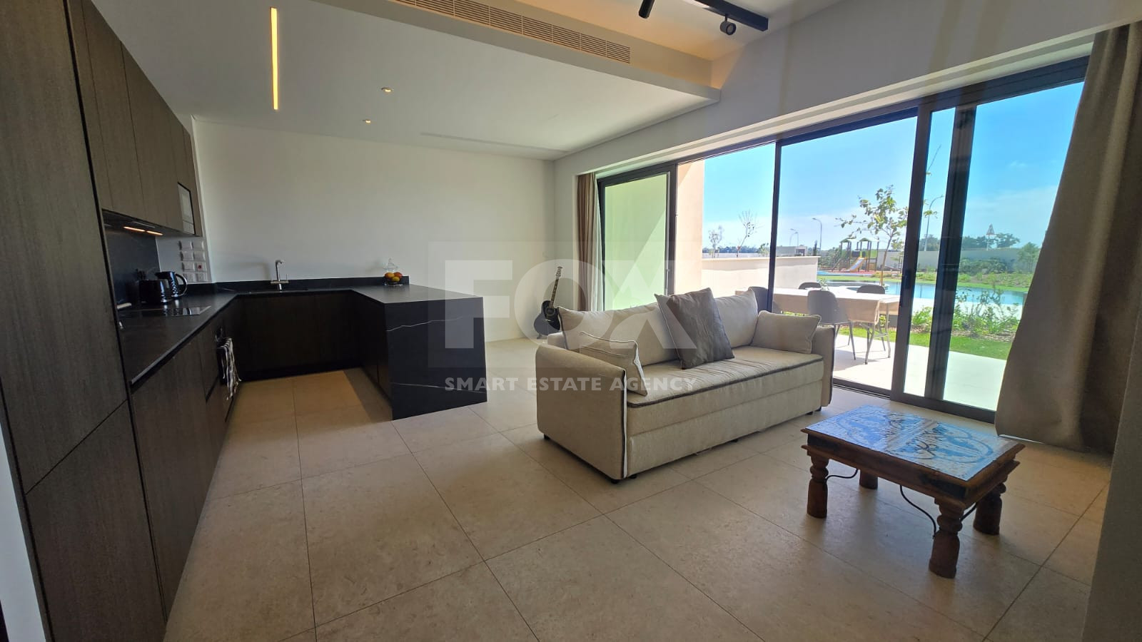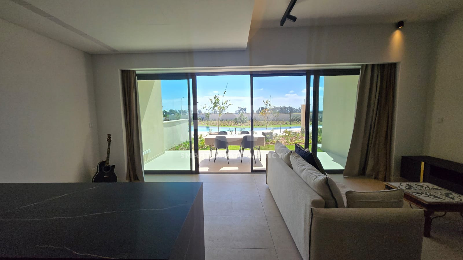 The residence features a bright open-plan living and dining area with direct access to the outdoor space. Large openings allow natural light throughout while maximizing the views.