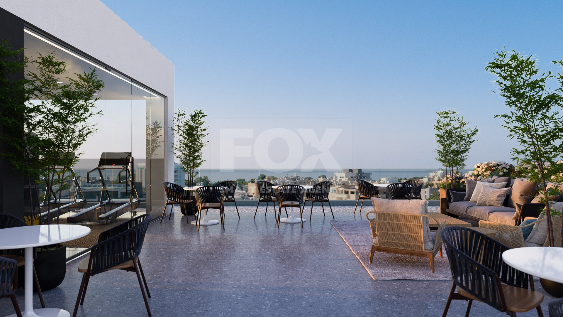 The rooftop is designed as a lifestyle extension of the workplace, featuring a gym and coffee area—perfect for breaks, networking, or unwinding with panoramic views.