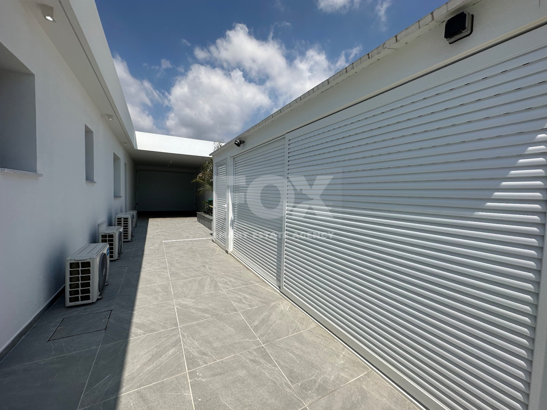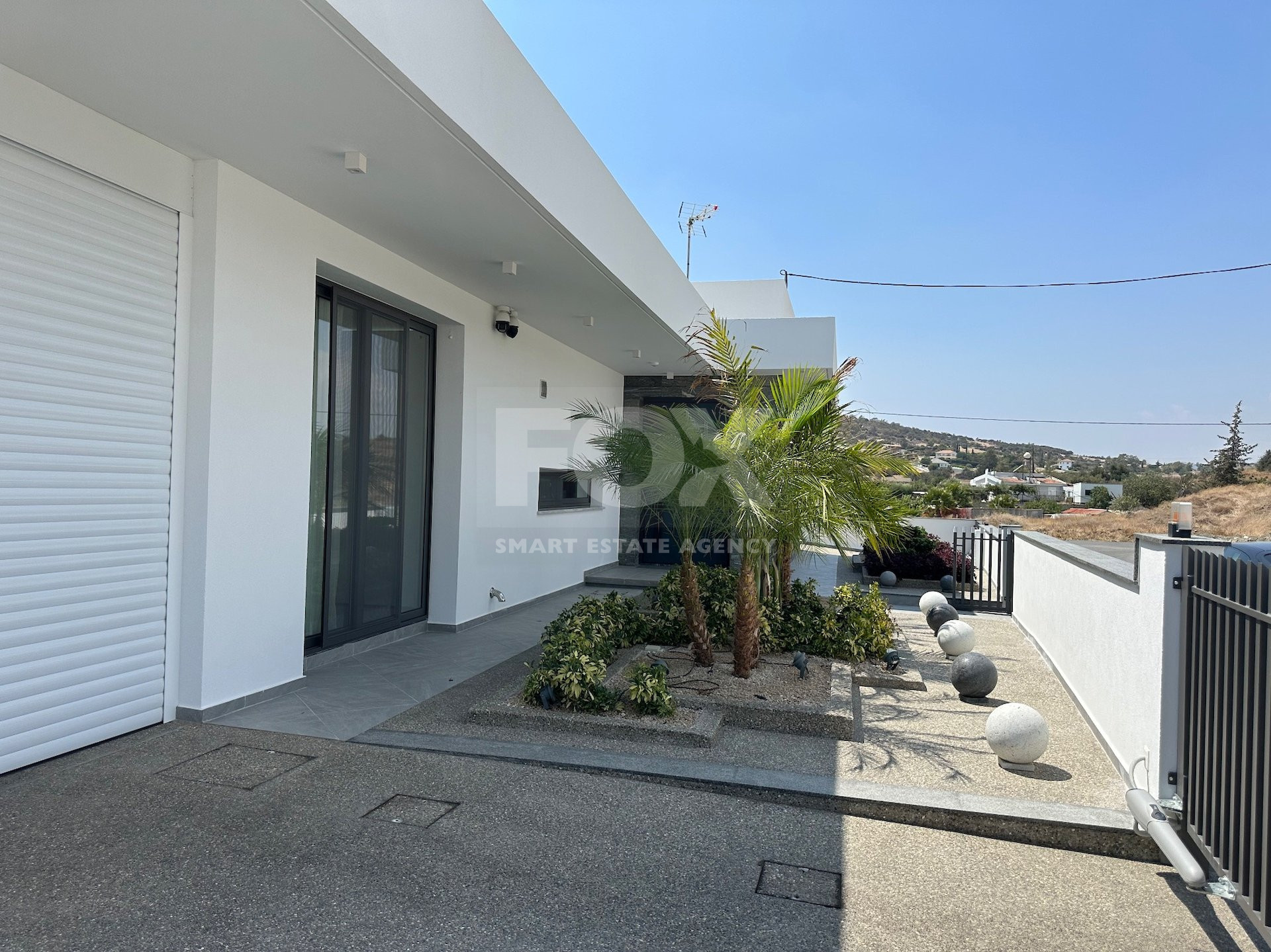 Electric gate entrance and indoor parking garage for 3 cars.