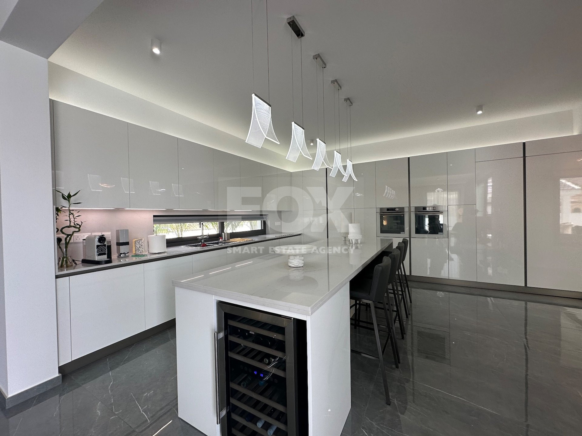 Spacious dining area and fully equipped kitchen with island bar and wine fridge.
