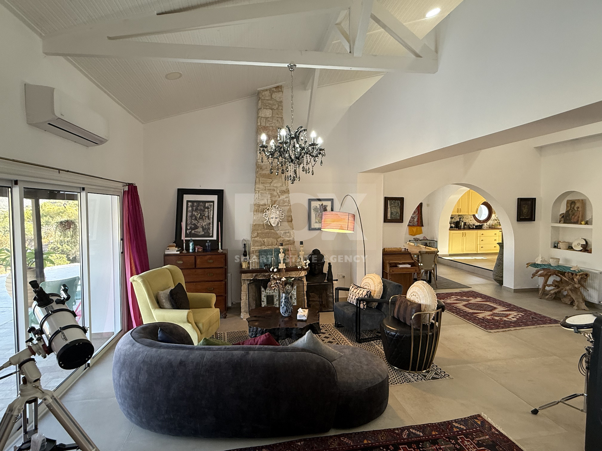 Upon entering the home, you are welcomed by a bright entrance hall leading to spacious open-plan lounge, dining, and sitting areas, all featuring high, exposed wooden ceilings and natural wooden flooring. The fully equipped kitchen includes a separate utility room and opens out through large patio doors to expansive outdoor terraces and landscaped grounds—ideal for al fresco dining and entertaining.