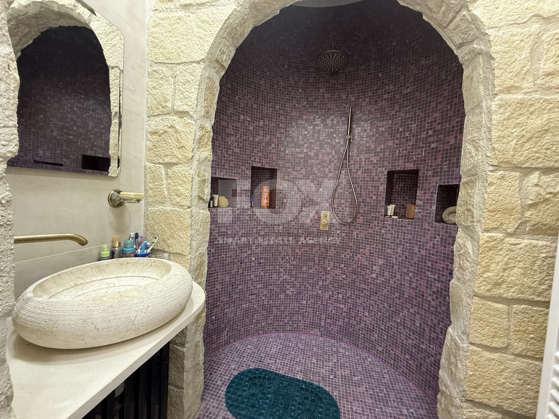 Additional features include central heating throughout, air conditioning units, charming stone archways, and multiple outdoor seating areas.