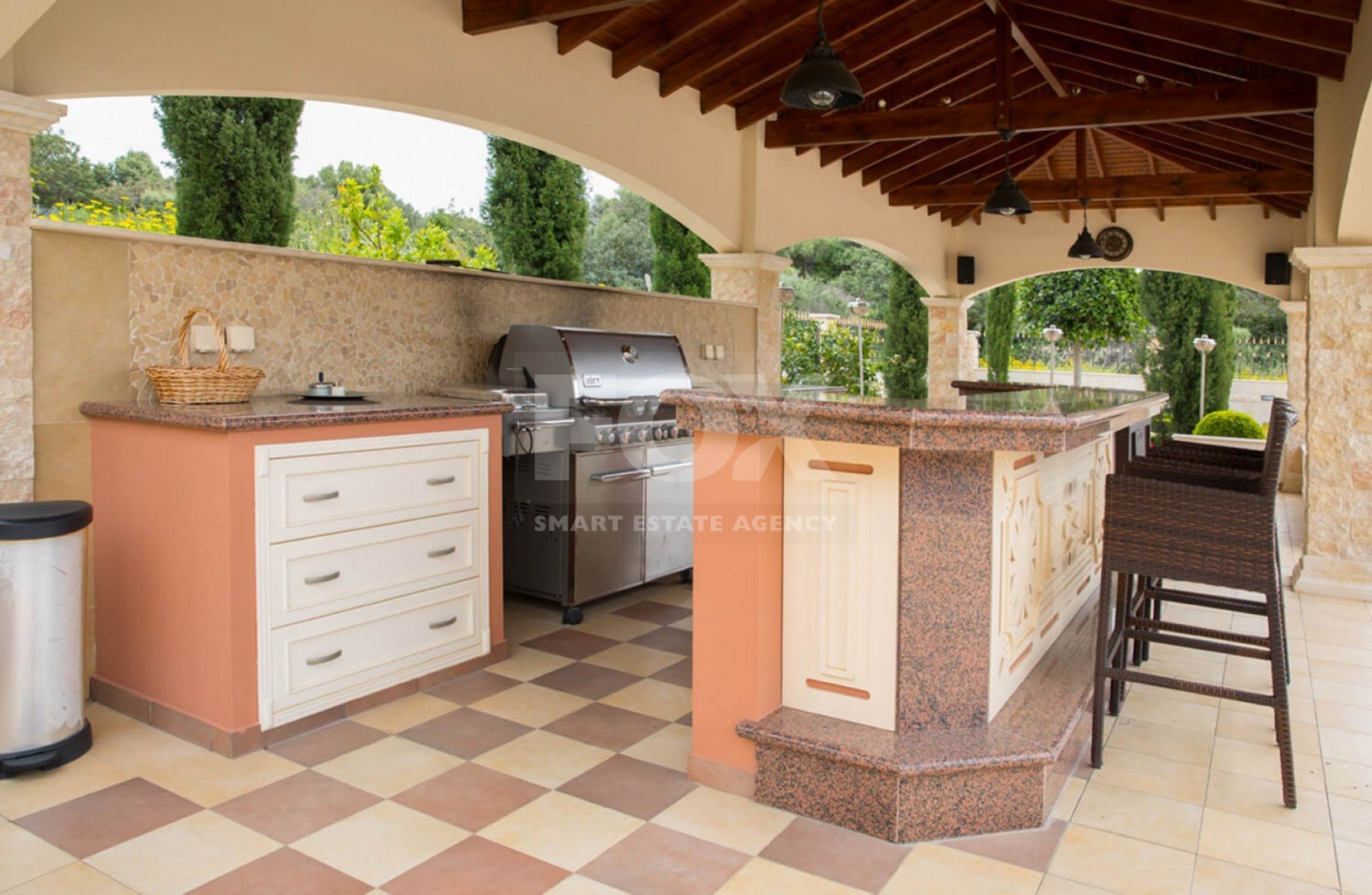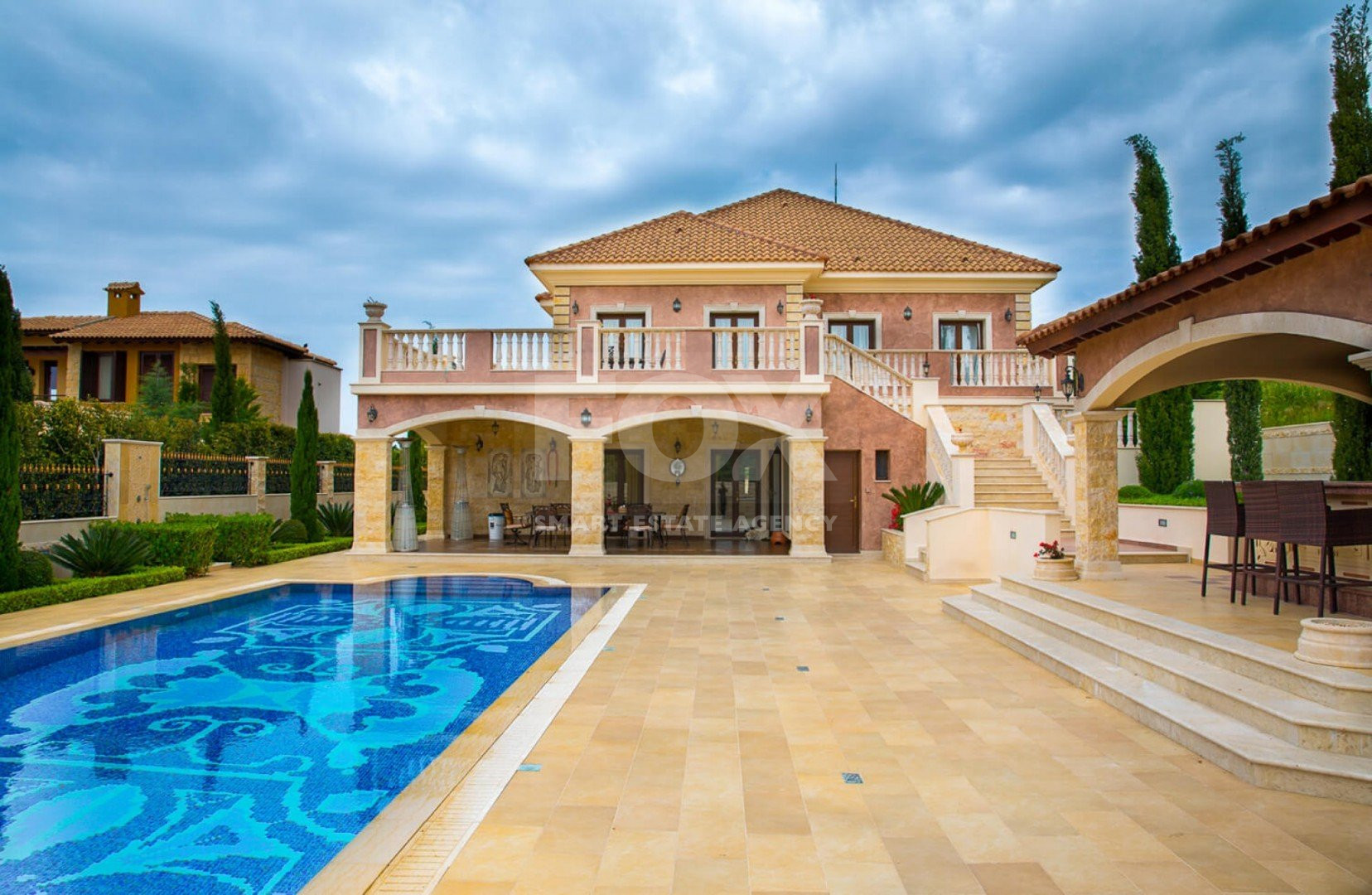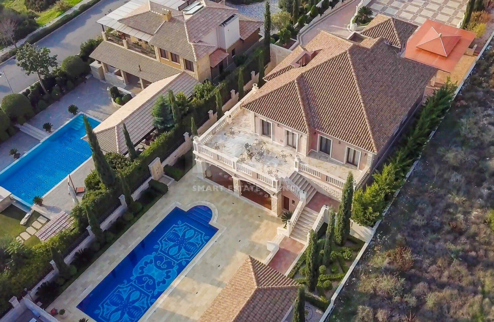 Large terraces, extensive outdoor lounge and dining spaces, a fully fitted outdoor kitchen and bar with surround sound, and a 12m x 5m mosaic-tiled overflow swimming pool all contribute to a refined indoor–outdoor lifestyle in one of the most sought-after locations of Aphrodite Hills.