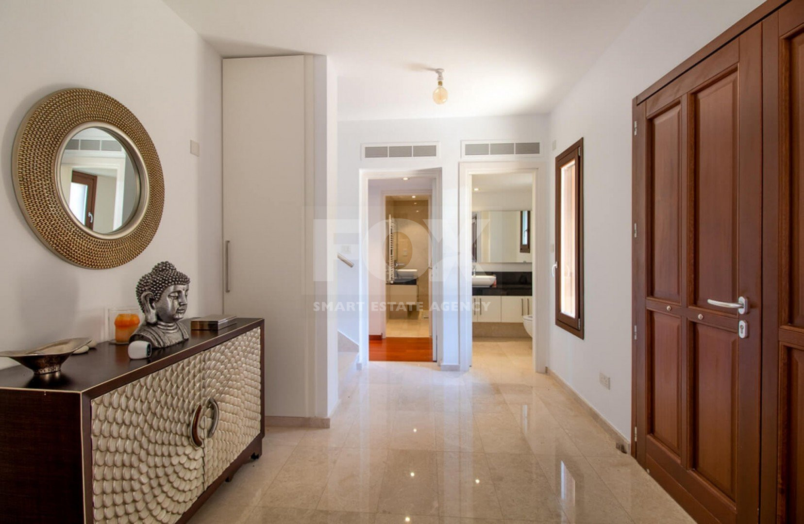 A marble staircase leads to the first floor, where three additional bedrooms enjoy wide-sweeping sea views. The master suite is exceptional, offering a luxurious king-size bed and French doors that open onto a private balcony overlooking the coastline. The elegant en-suite bathroom, fully tiled in granite, includes twin washbasins, a WC, a bath, and a separate shower.