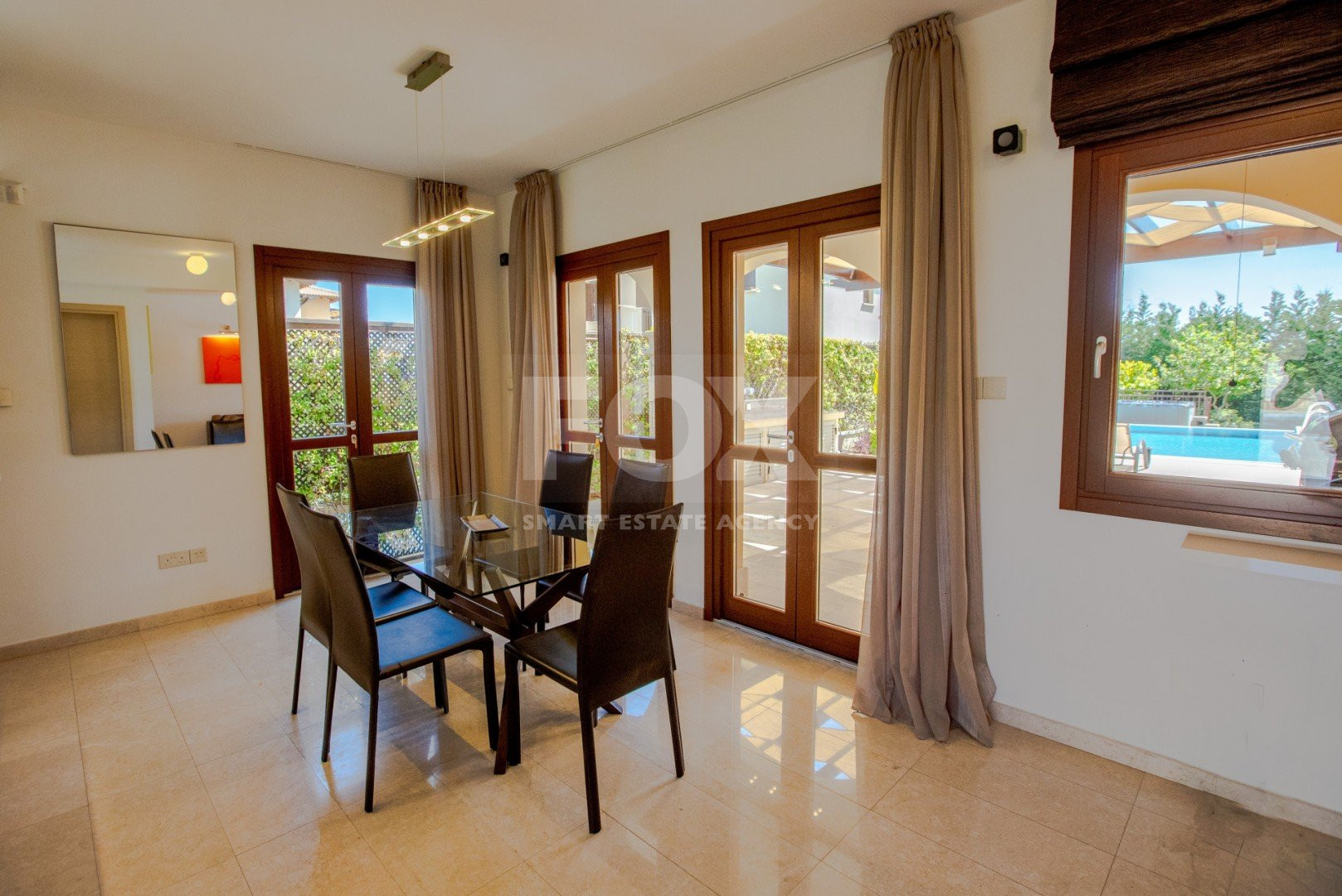 The interior of the villa is stylish and contemporary and offers light and airy open plan living areas. Attention to detail is evident everywhere with the highest quality Italian-style kitchen units, lavish marble bathrooms and marble or parquet flooring throughout. The impressive entrance opens into the spacious open plan living/dining area which features sets of French doors opening out onto the pool terrace. The lounge is beautifully finished with a plush sofa and armchair, large flat-screen TV and delightfully quirky accessories such as the designer coffee table and contrasting wall art. The adjacent dining area with modern dining table and chairs is separated from the kitchen by a handy sideboard. The kitchen is fitted with stylish high-gloss units including electric oven and hob, integrated dishwasher, washing machine and microwave. The ground floor also has a conveniently located cloakroom.