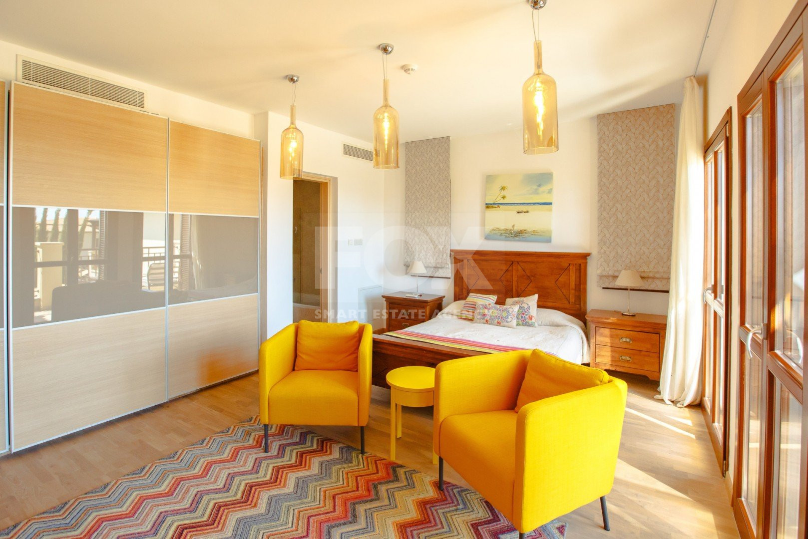 Upstairs, the spacious bedrooms are beautifully fitted with parquet floor and features attractive drapes and soft furnishings. Furnished with a king size/double beds, TV, dressers and matching side tables it offers a private balcony for each offering extensive sea views. The en-suite bathroom is fitted with twin wash basins in a marble vanity unit, and bath/shower combination.
