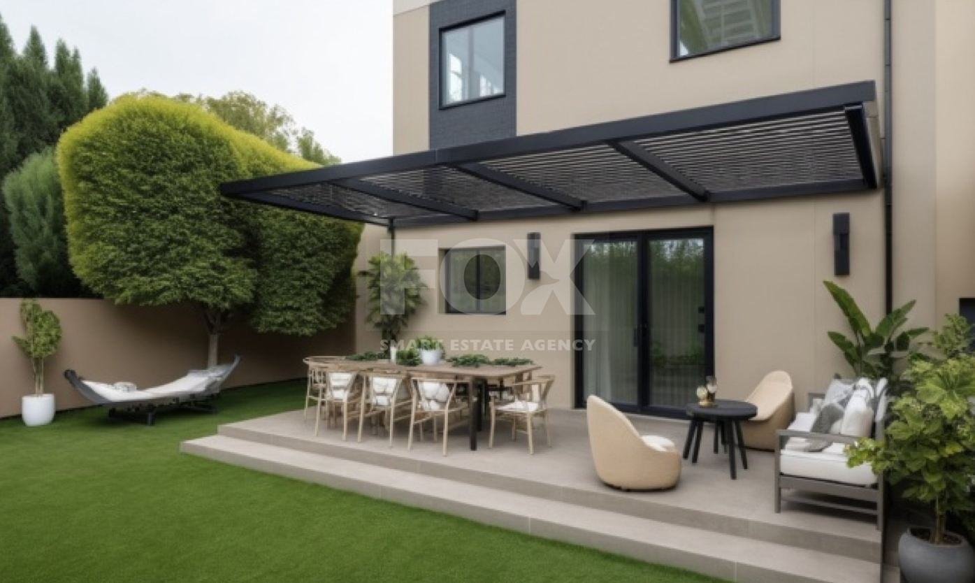Large sliding doors lead to a charming veranda and backyard with ample space for a garden, optional swimming pool, and barbecue area, perfect for outdoor living.