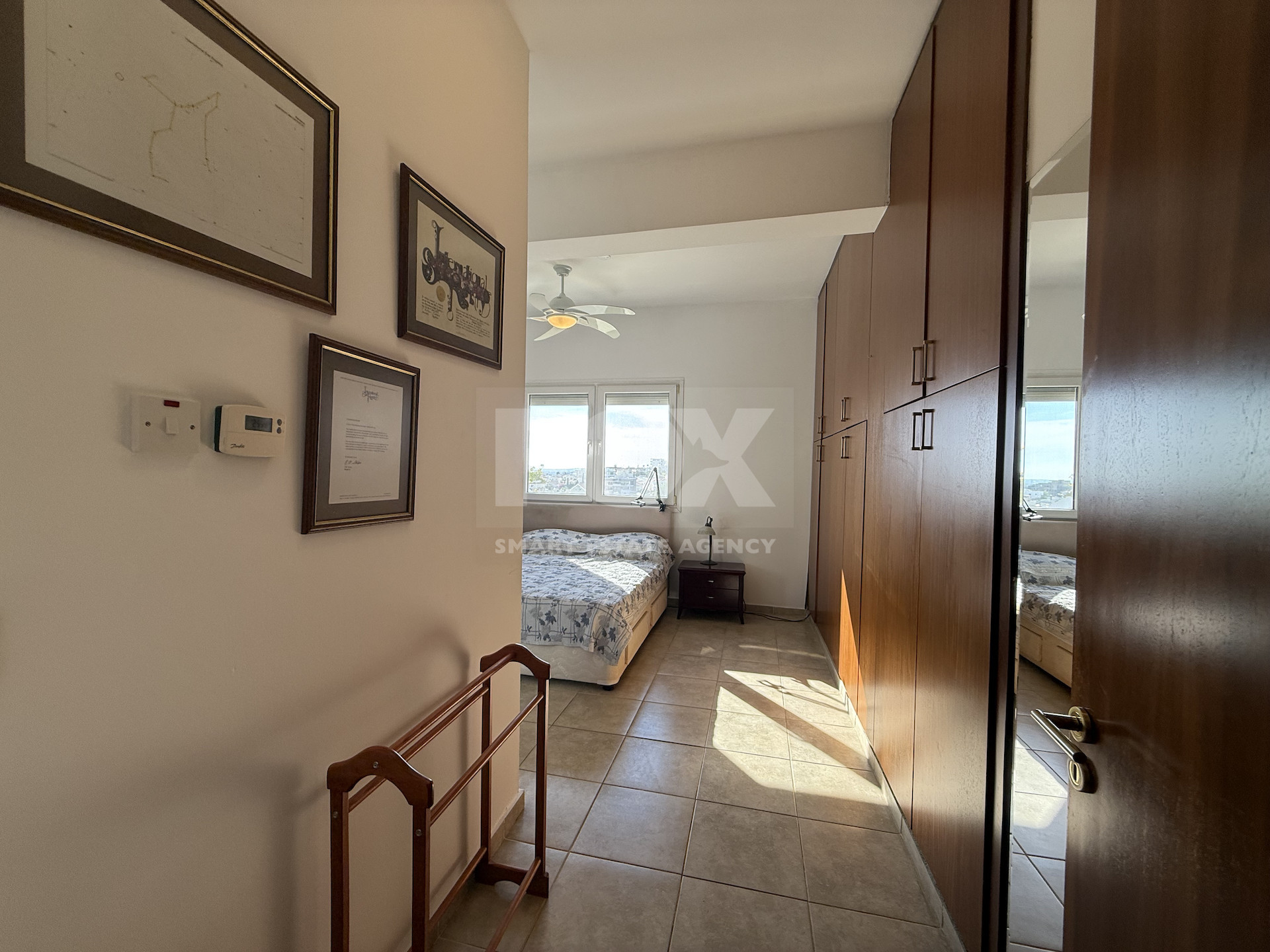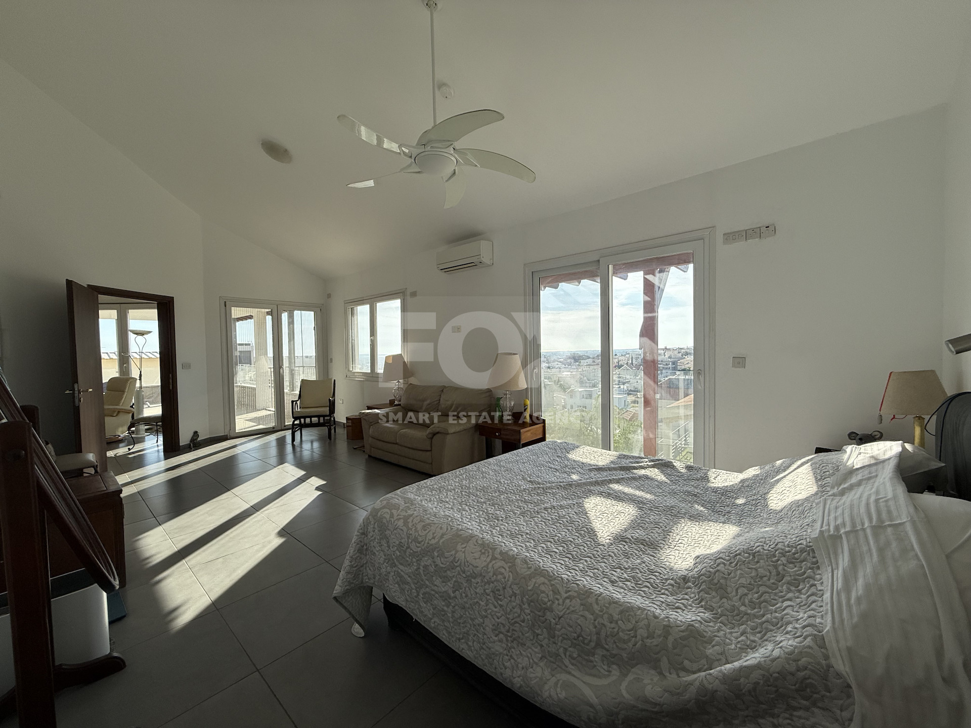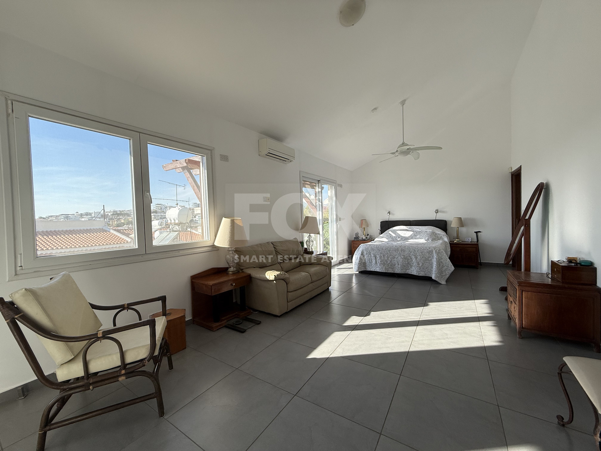 The upper level, originally an extension of the ground floor home, offers two generous bedrooms, two bathrooms, a spacious living and office area, and a large balcony with views.