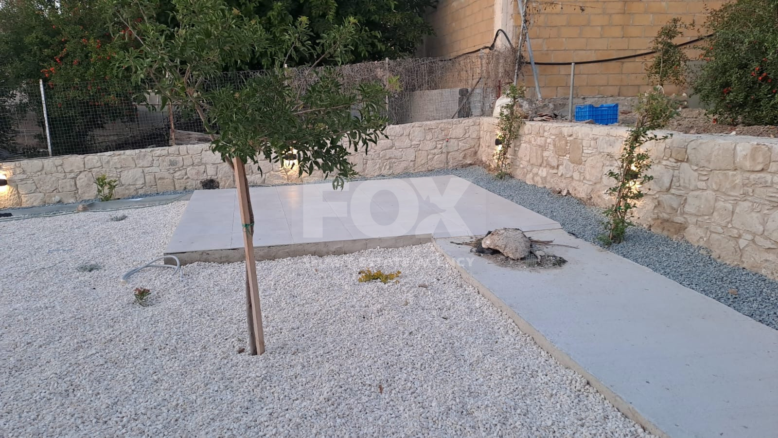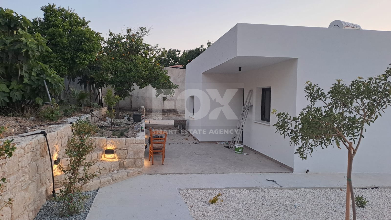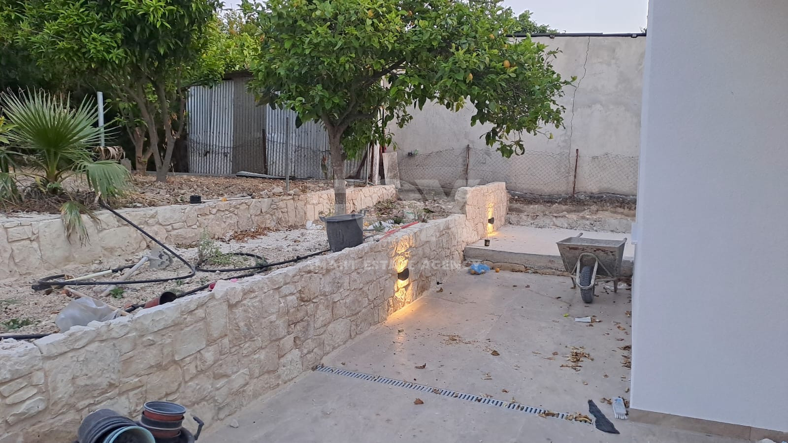 Expansive Outdoor Area: 604 sq.m. plot with tiered Mediterranean garden, stone-walled terraces, and mature fruit trees.