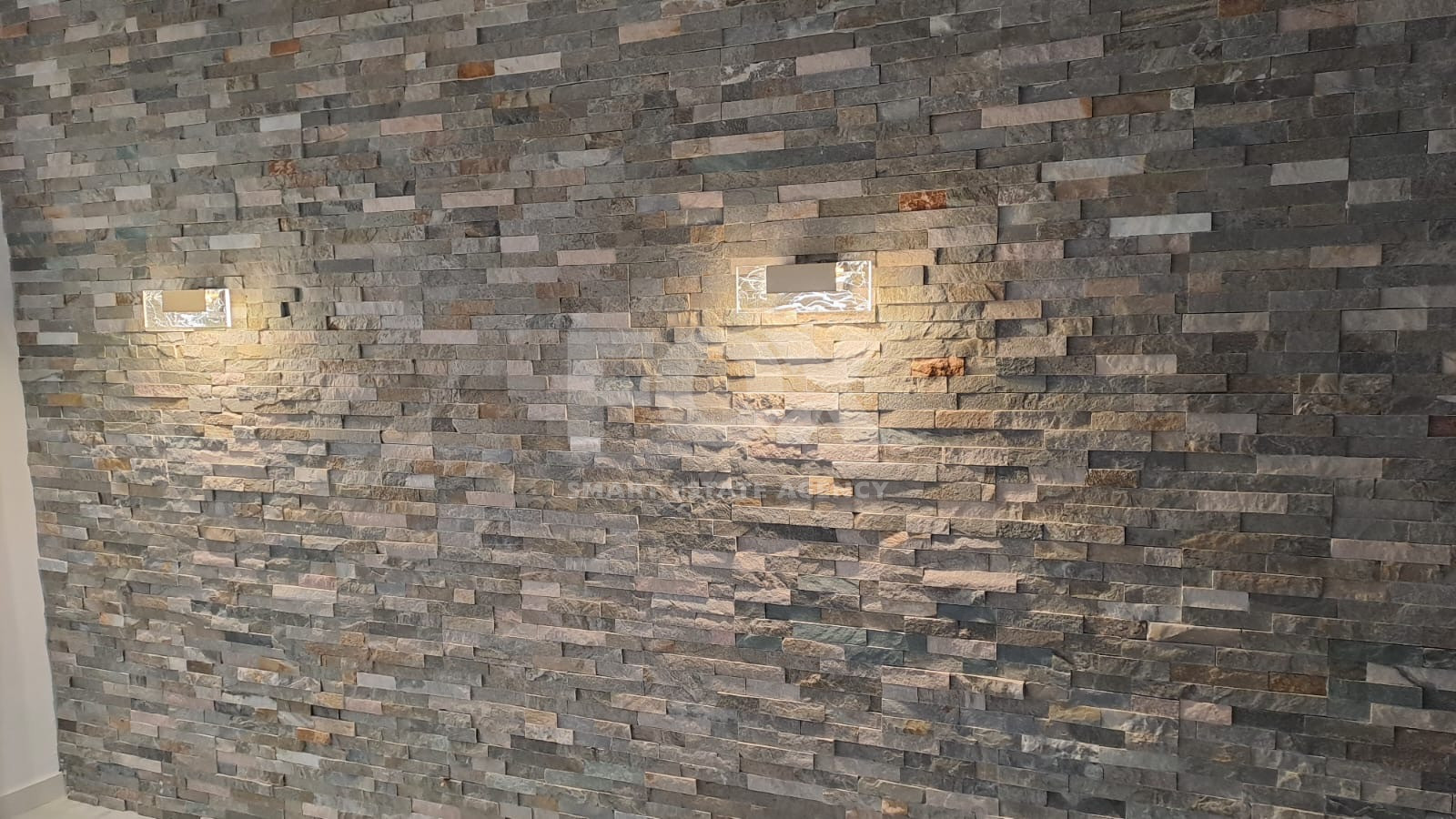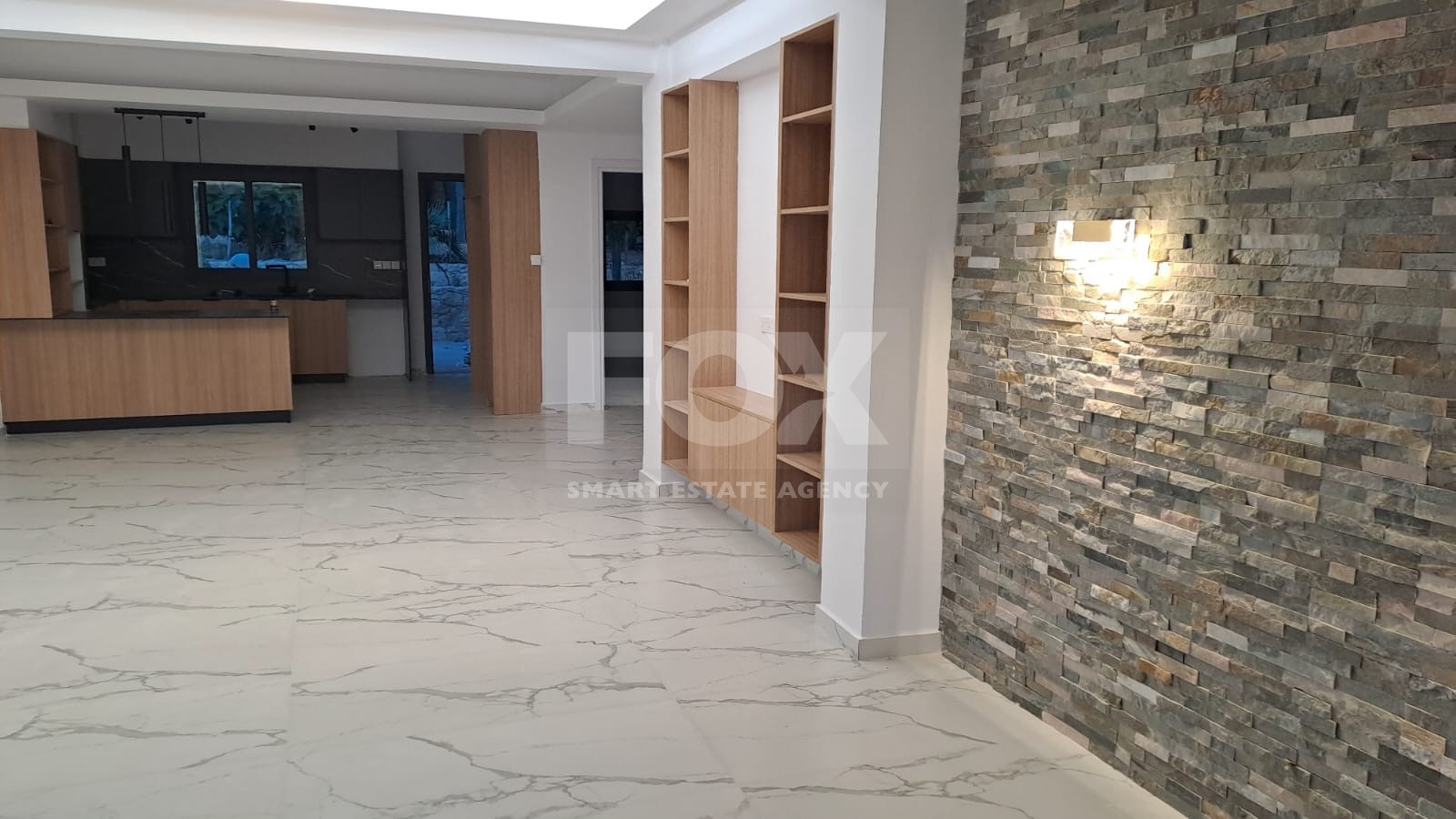 Premium Interior: Open-plan layout with designer kitchen, marble-effect tiles, and textured stone feature walls.