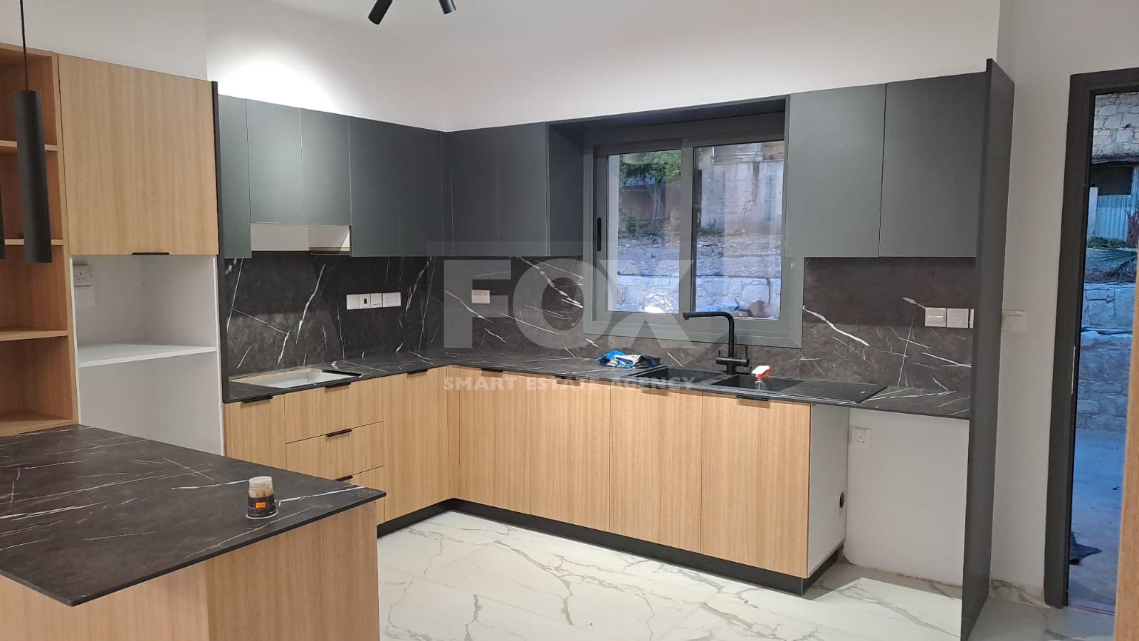 A: The villa boasts high-spec, contemporary finishes including marble-effect tiles, designer kitchen, and custom stone and oak features.
