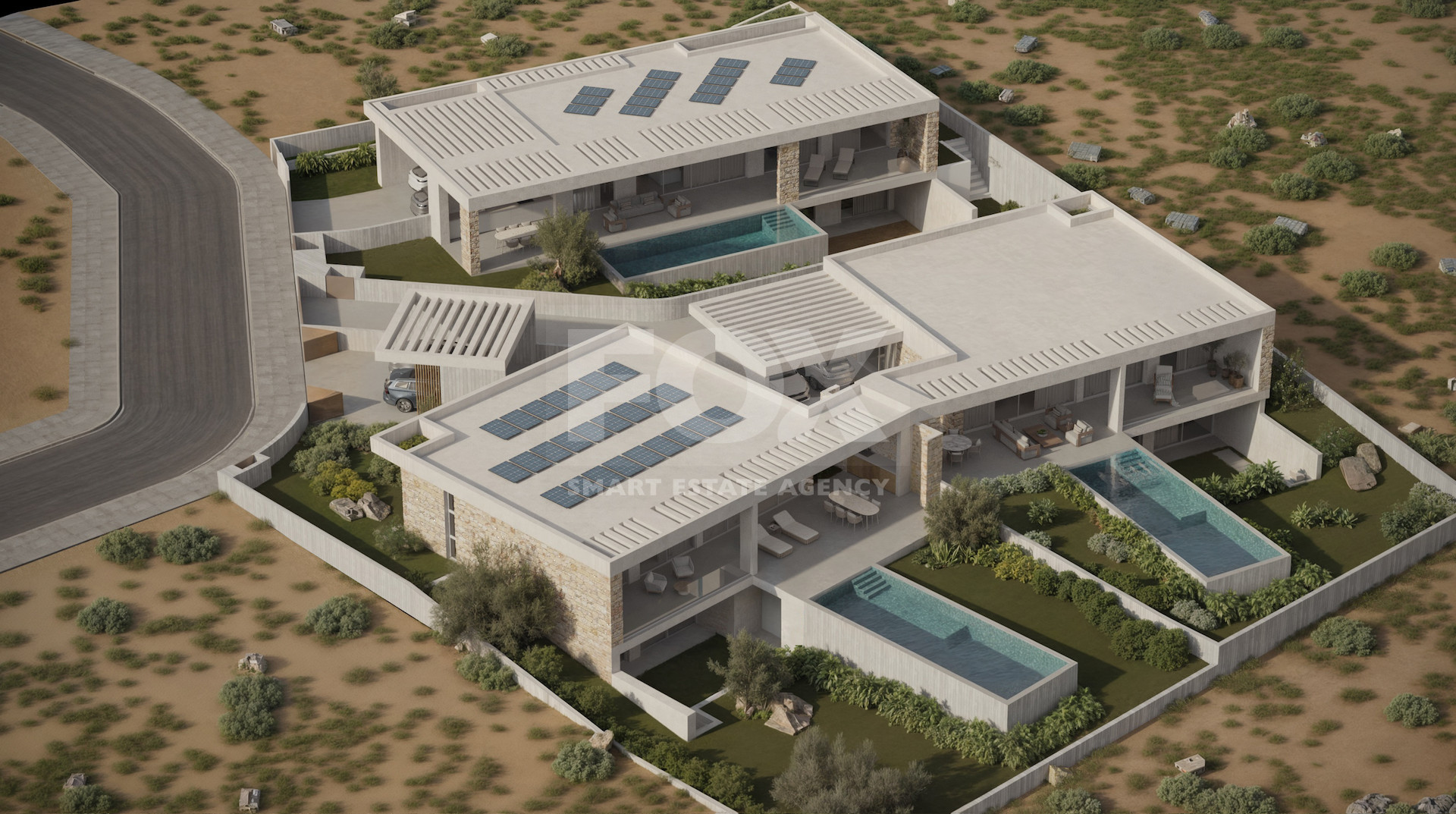 Notes: Prices include swimming pool, 10.1 kW photovoltaic system with solar panels, VRV for cooling, underfloor heating, alarm system, electric gate/charger. Furniture package from €50,000 + 19% VAT.