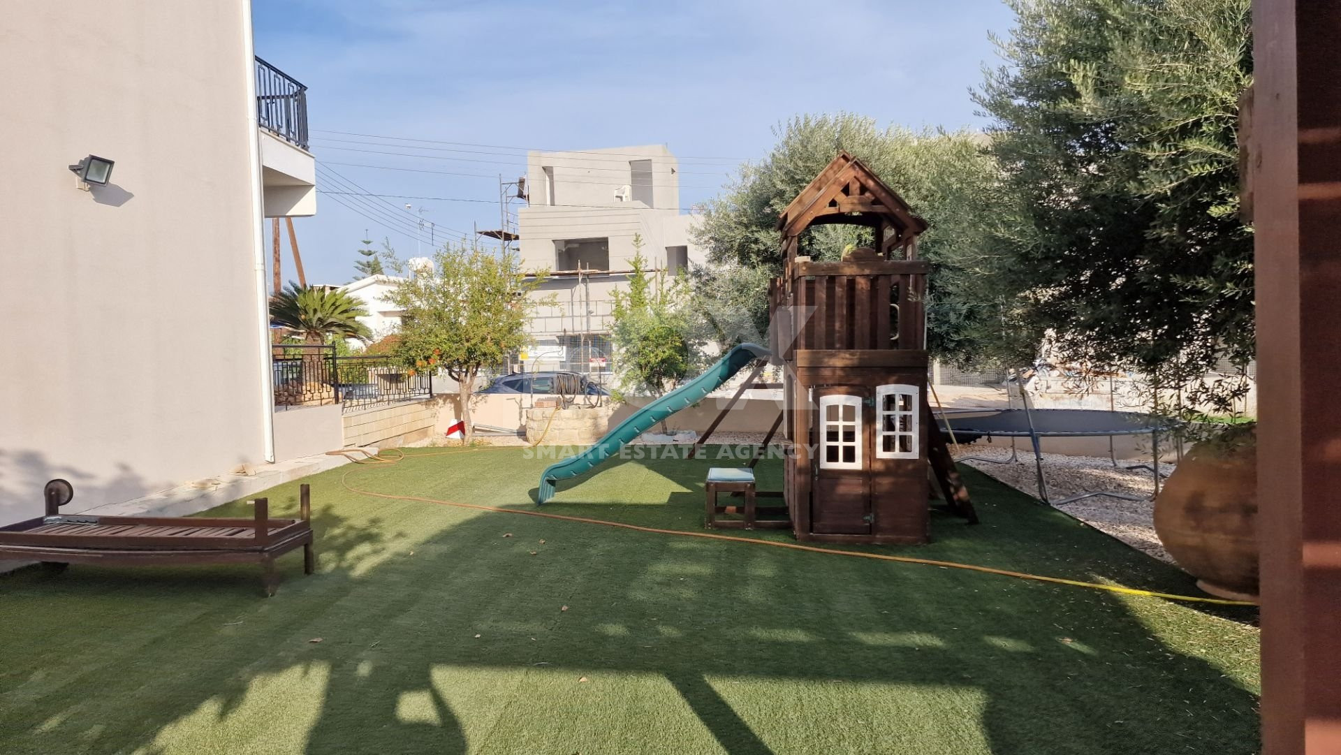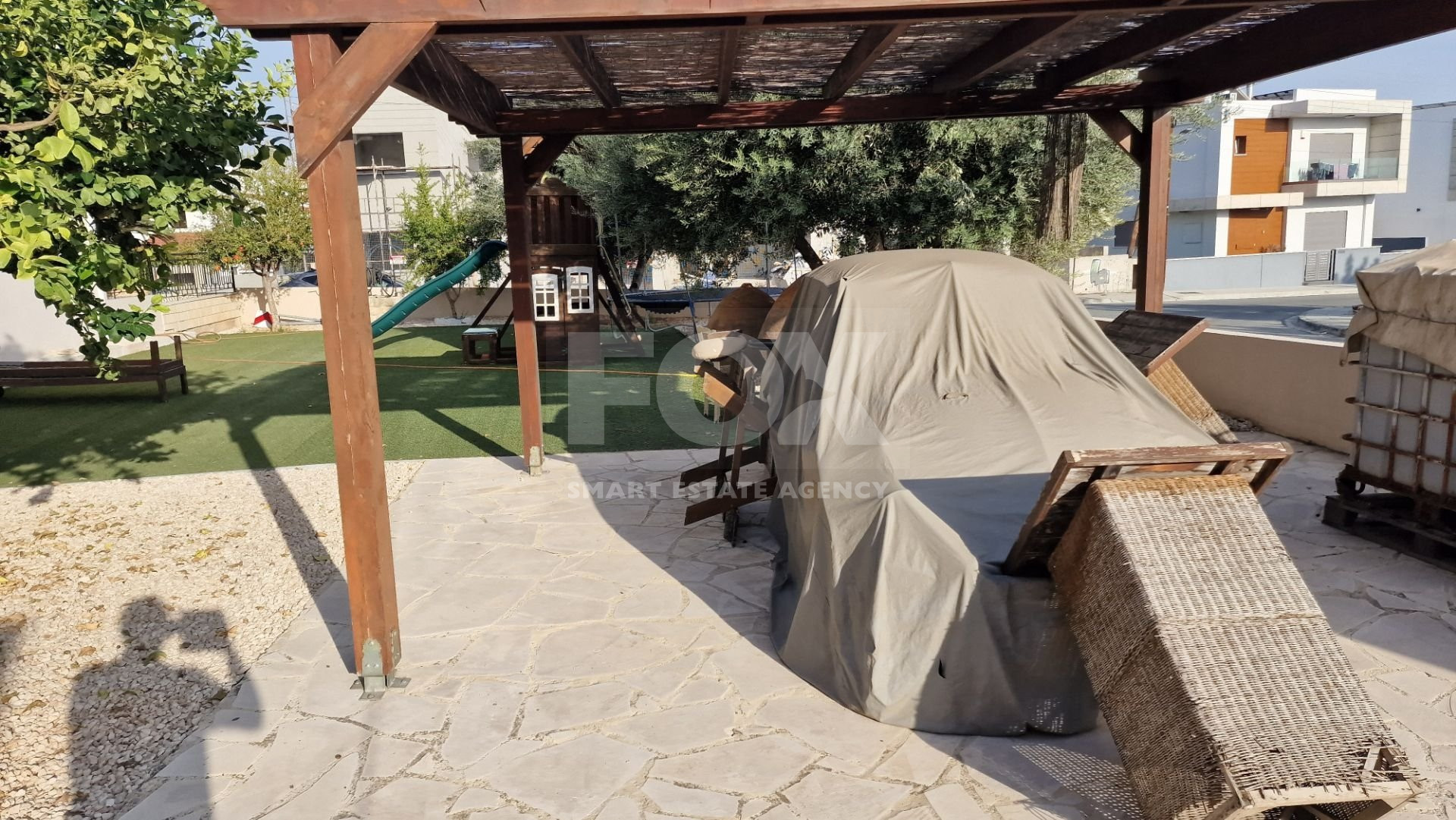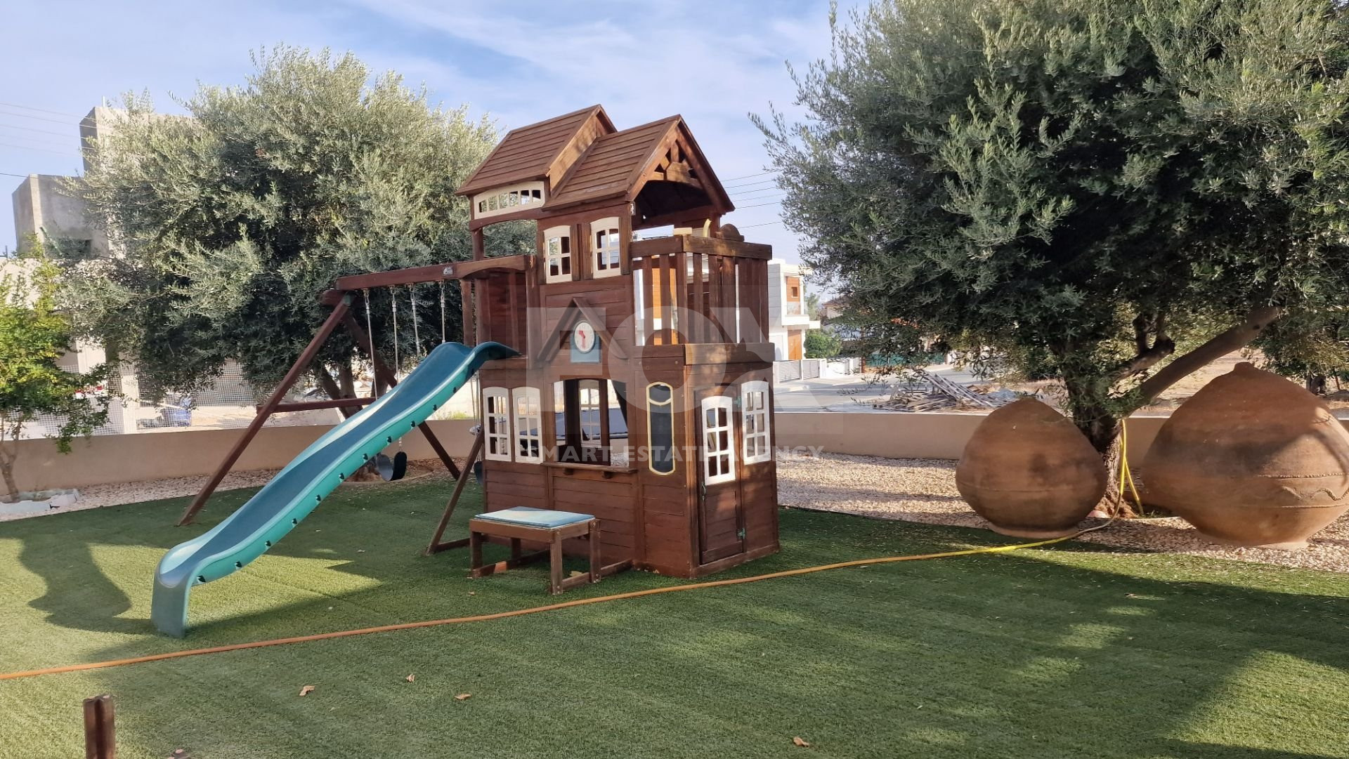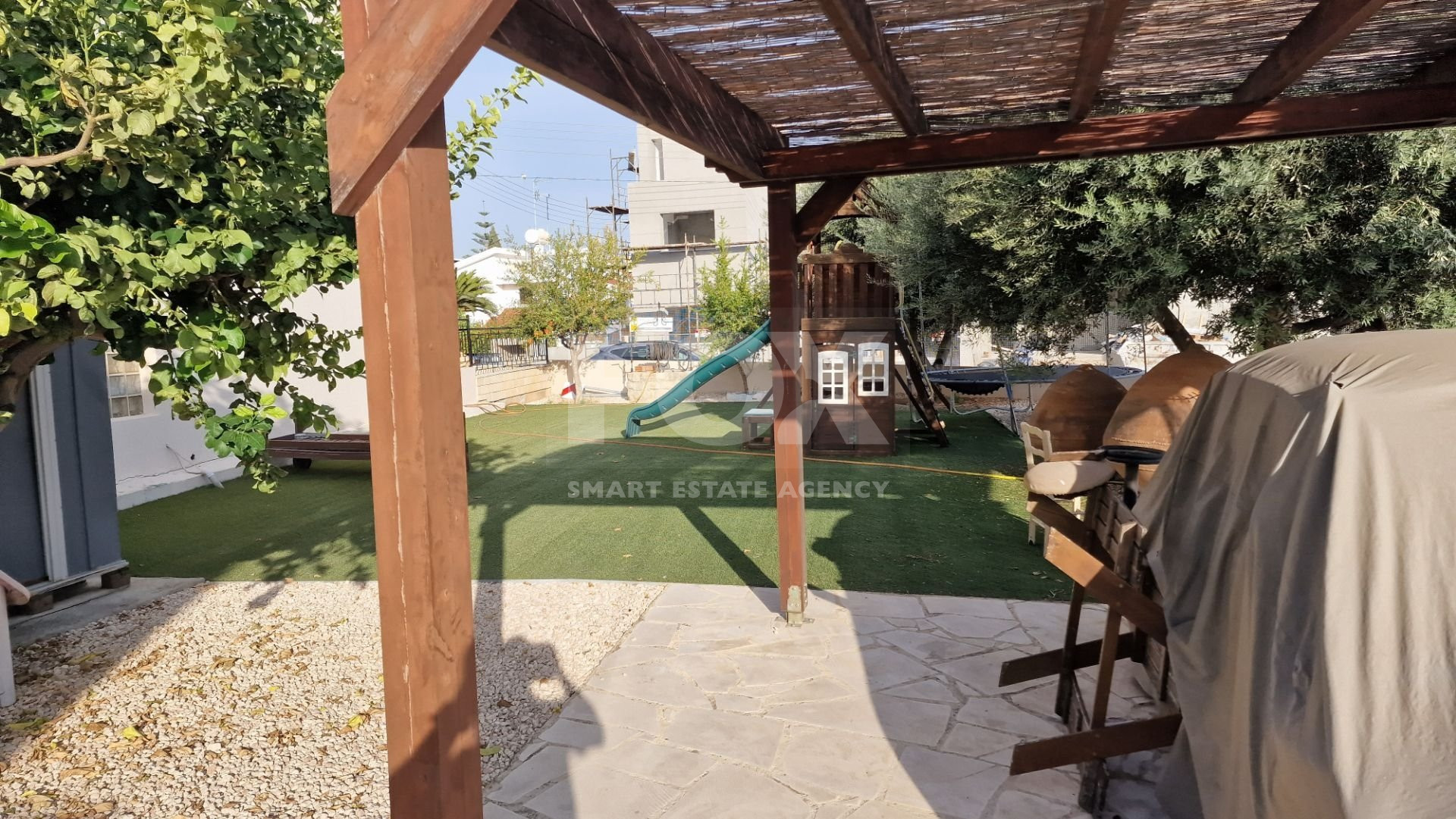 There is a large garden area with a children's play house and a pergola and artificial grass.