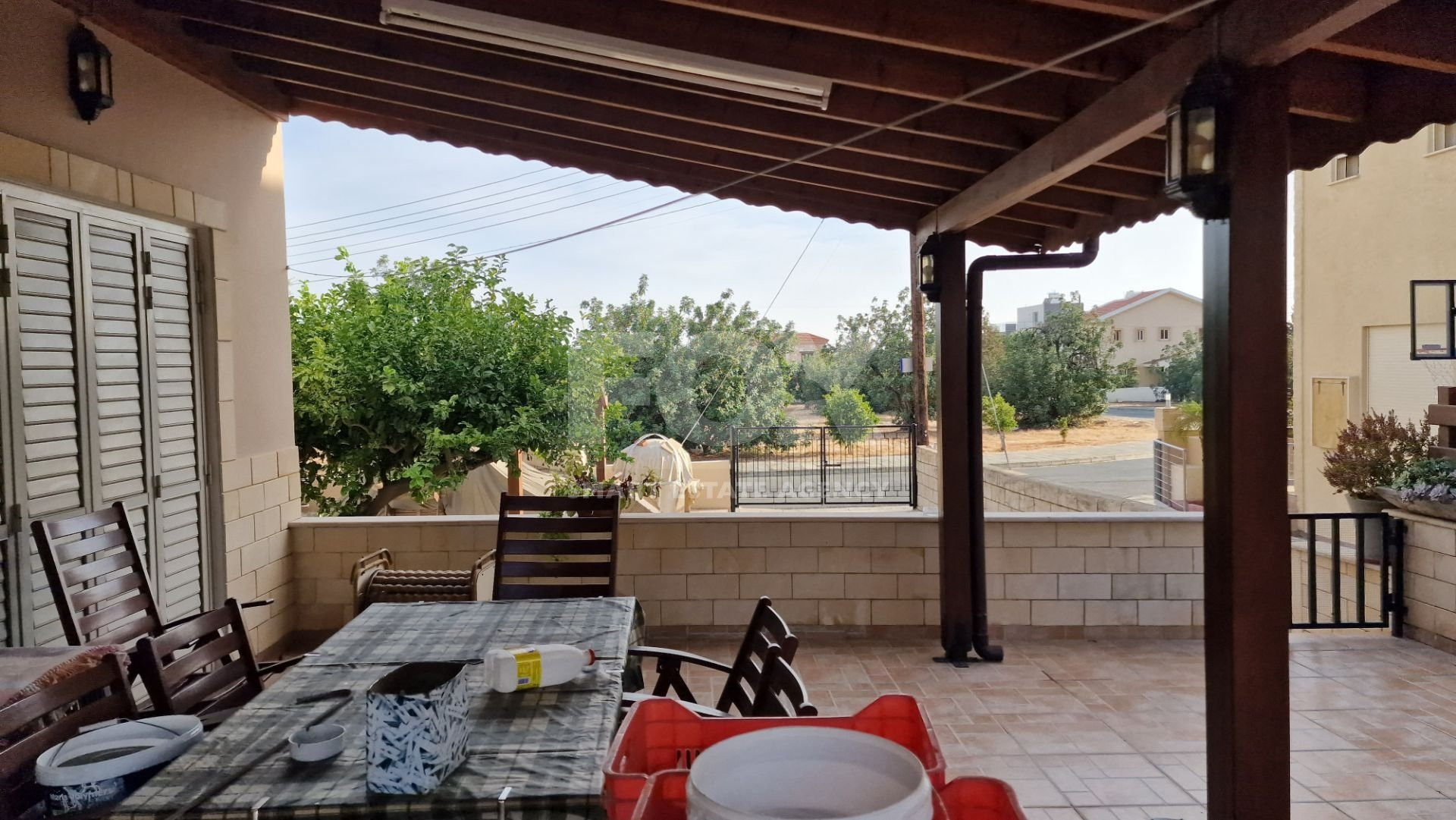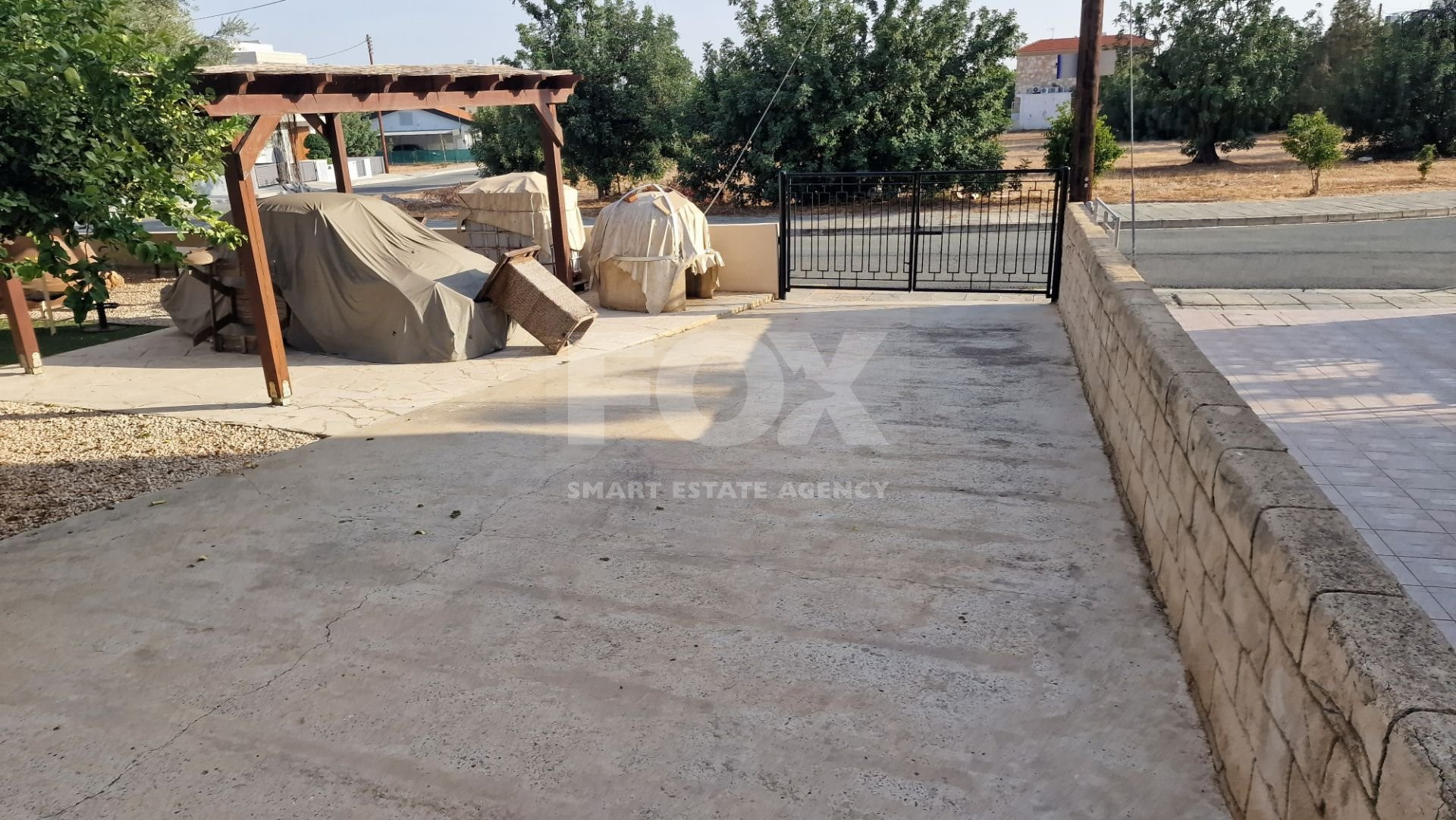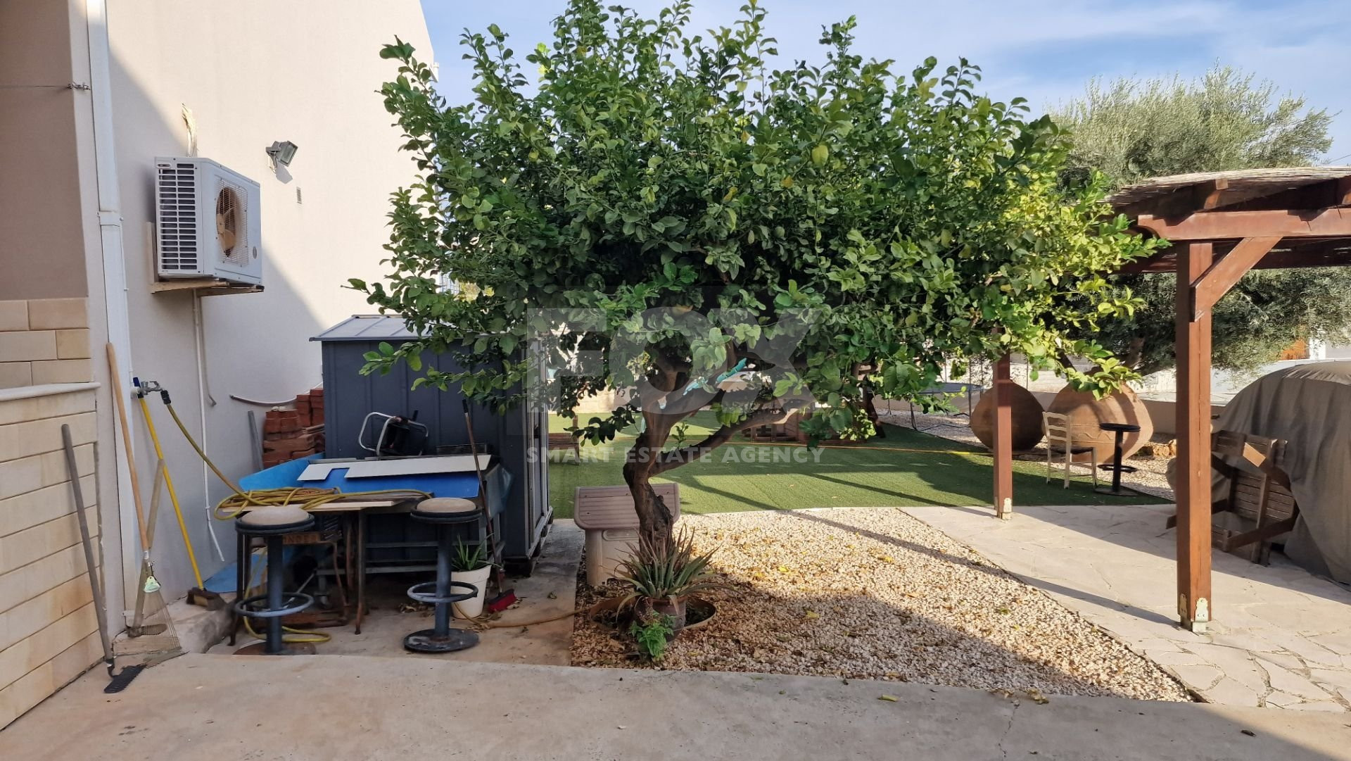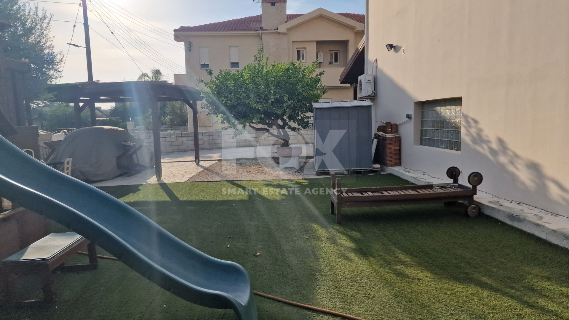 There is a large garden area with a children's play house and a pergola and artificial grass.