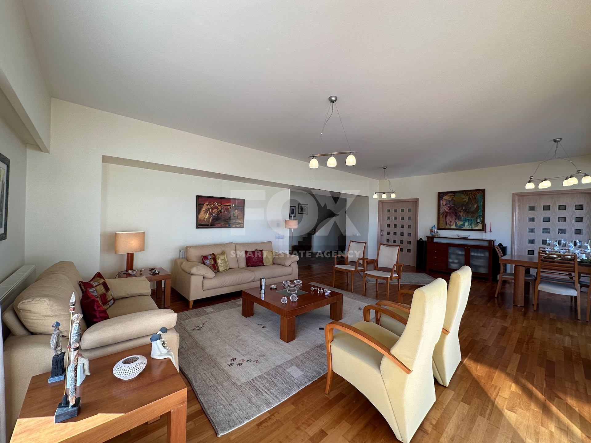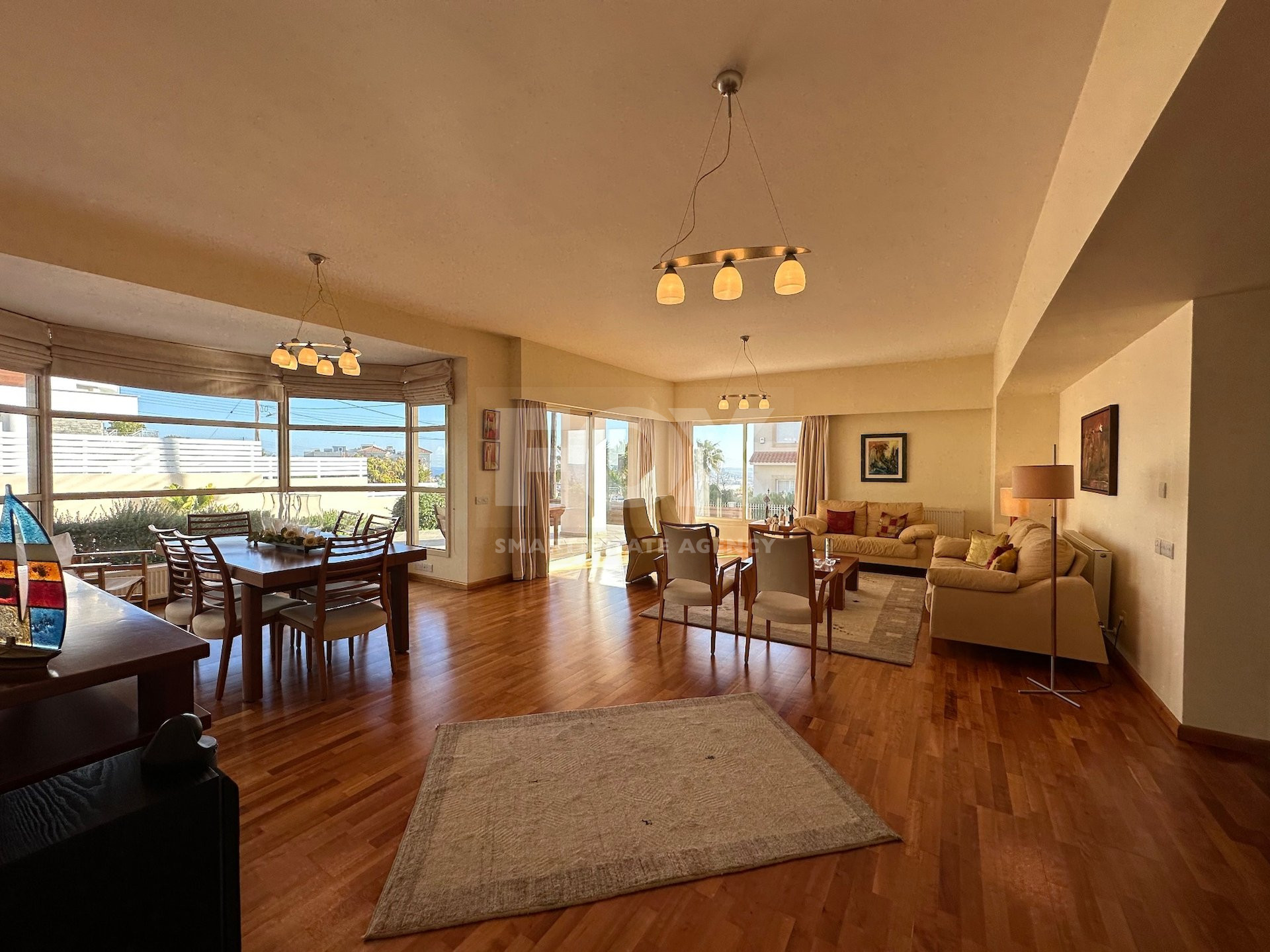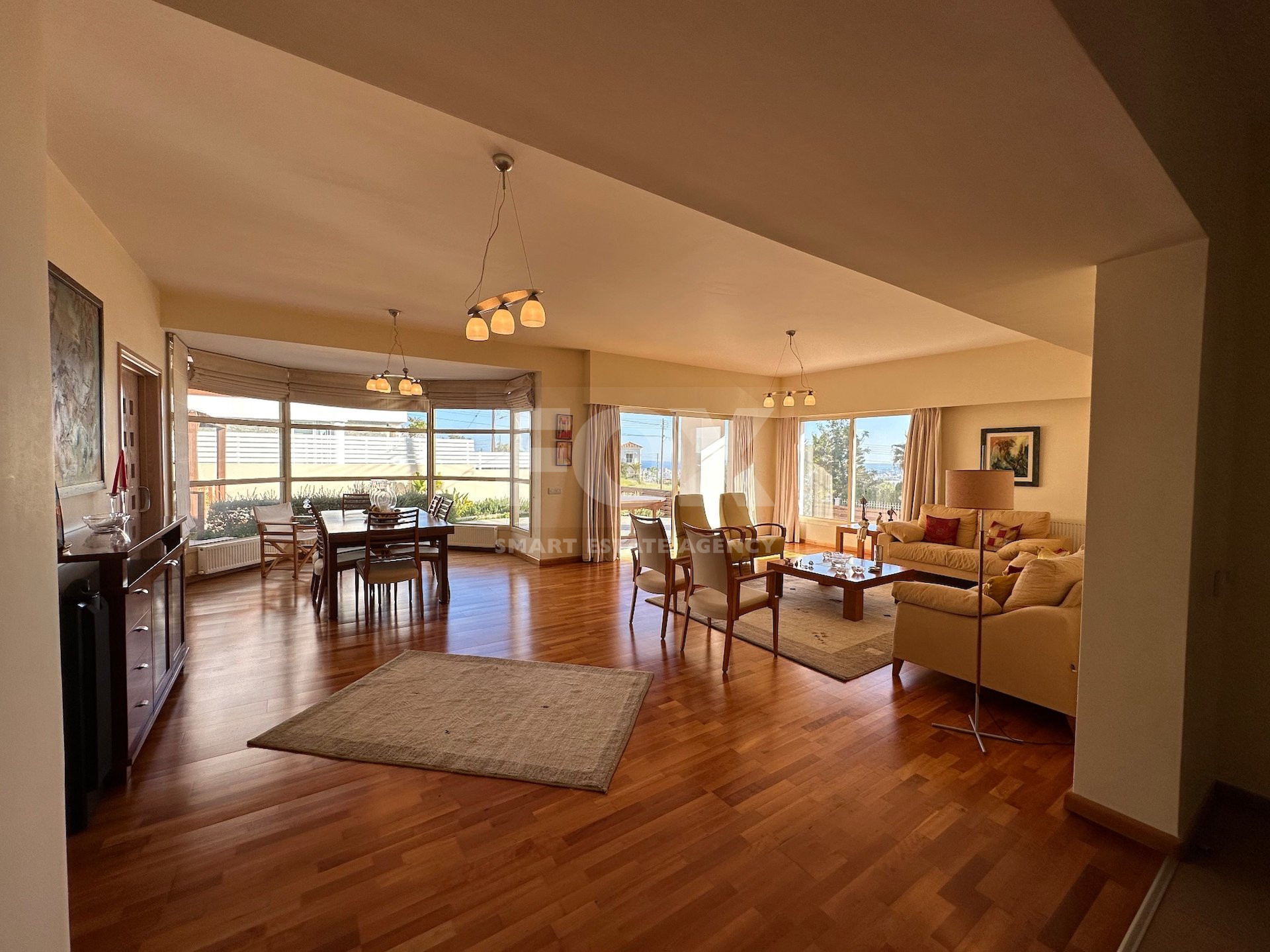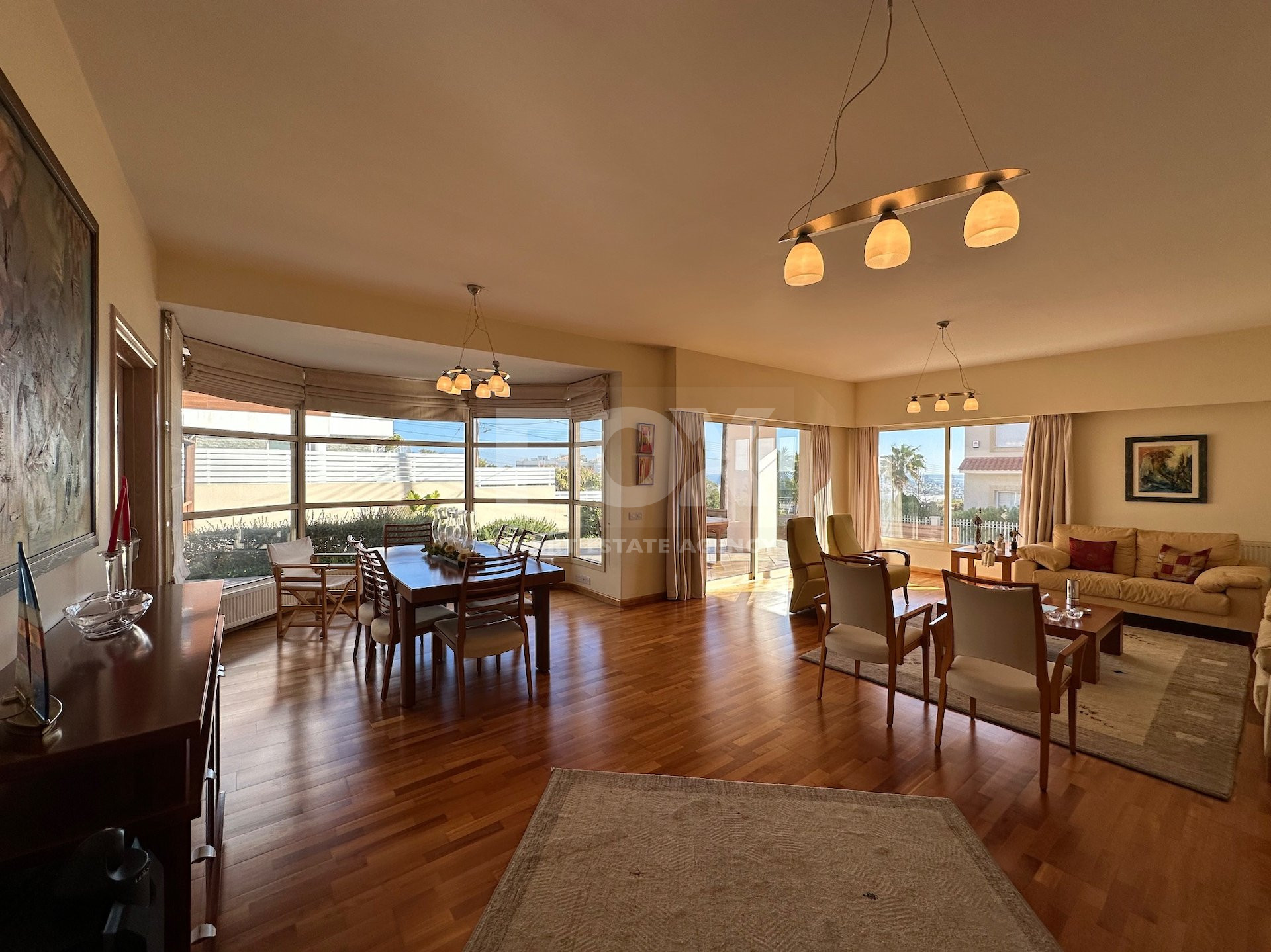 Entrance hall, sitting/dining area with patio doors opening onto the gardens, feature solid wooden parquet flooring throughout, doors lead through to a lounge TV area with built in fireplace, patio doors leading out to the garden. Fully equipped breakfast/diner with garden access, utility room, guest wc, ground level en suite bedroom/office, double electric garage.