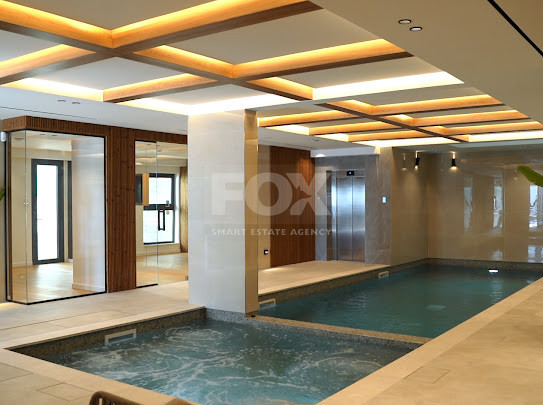 Built-in speakers in all rooms, including bedrooms, living room, indoor pool area, gym, garden, and roof terrace