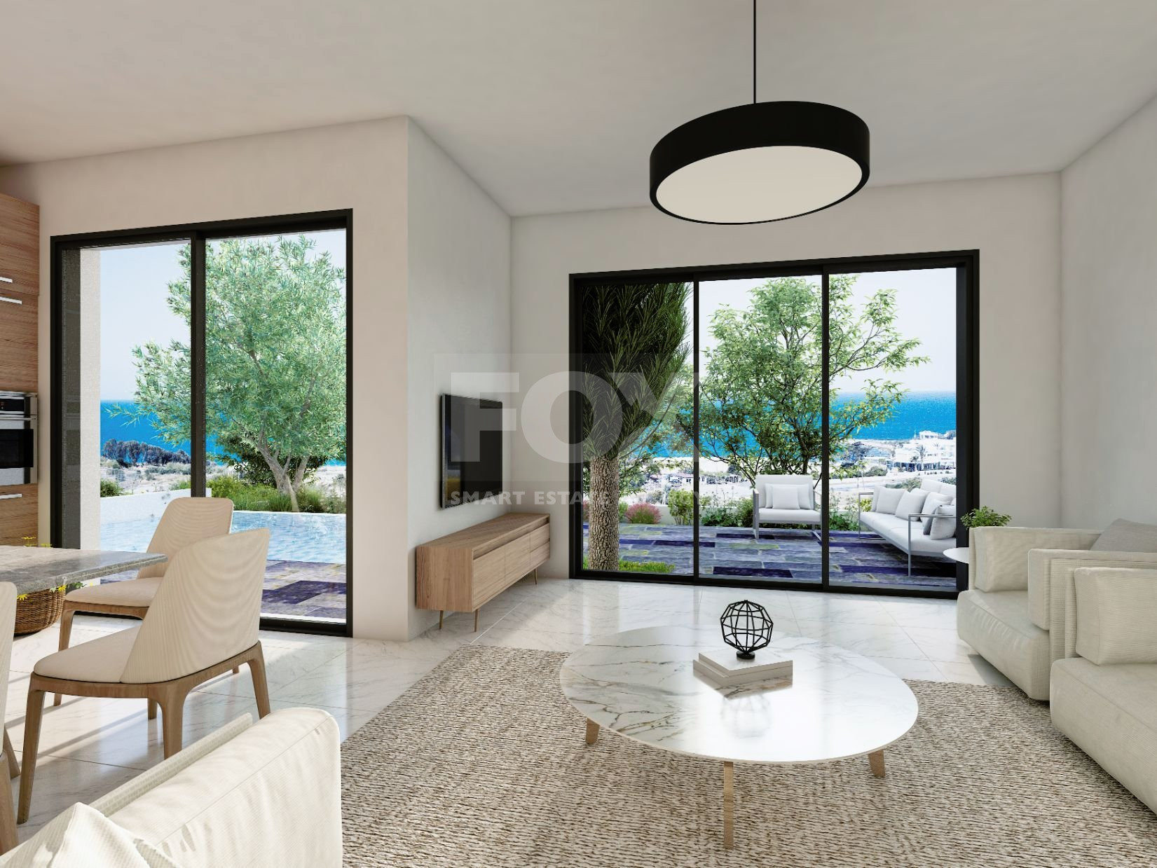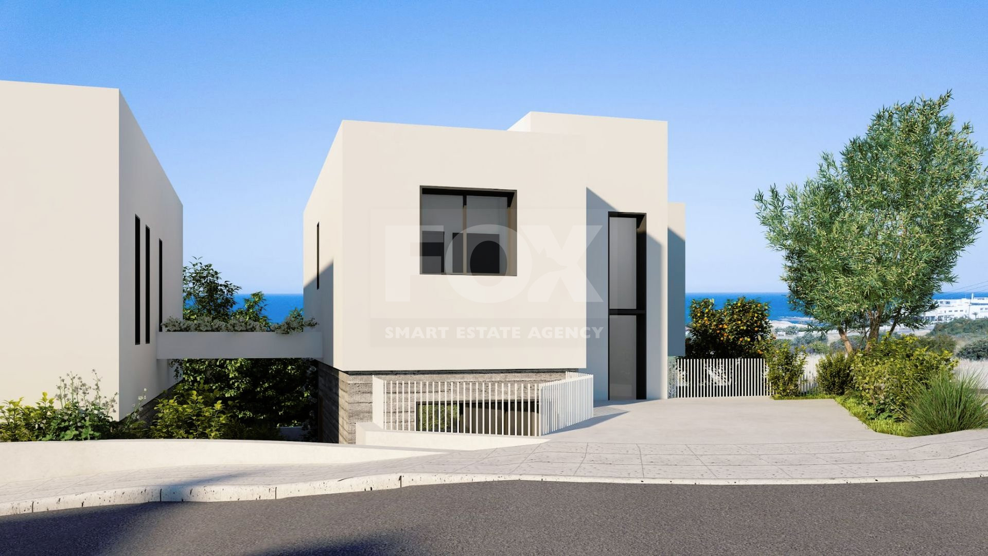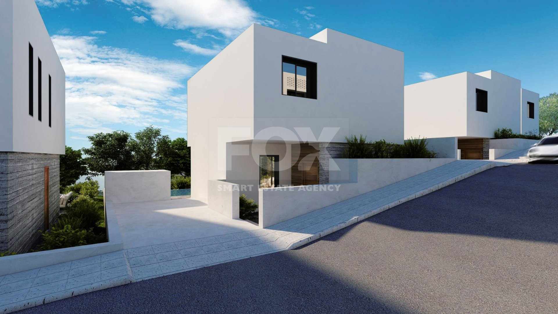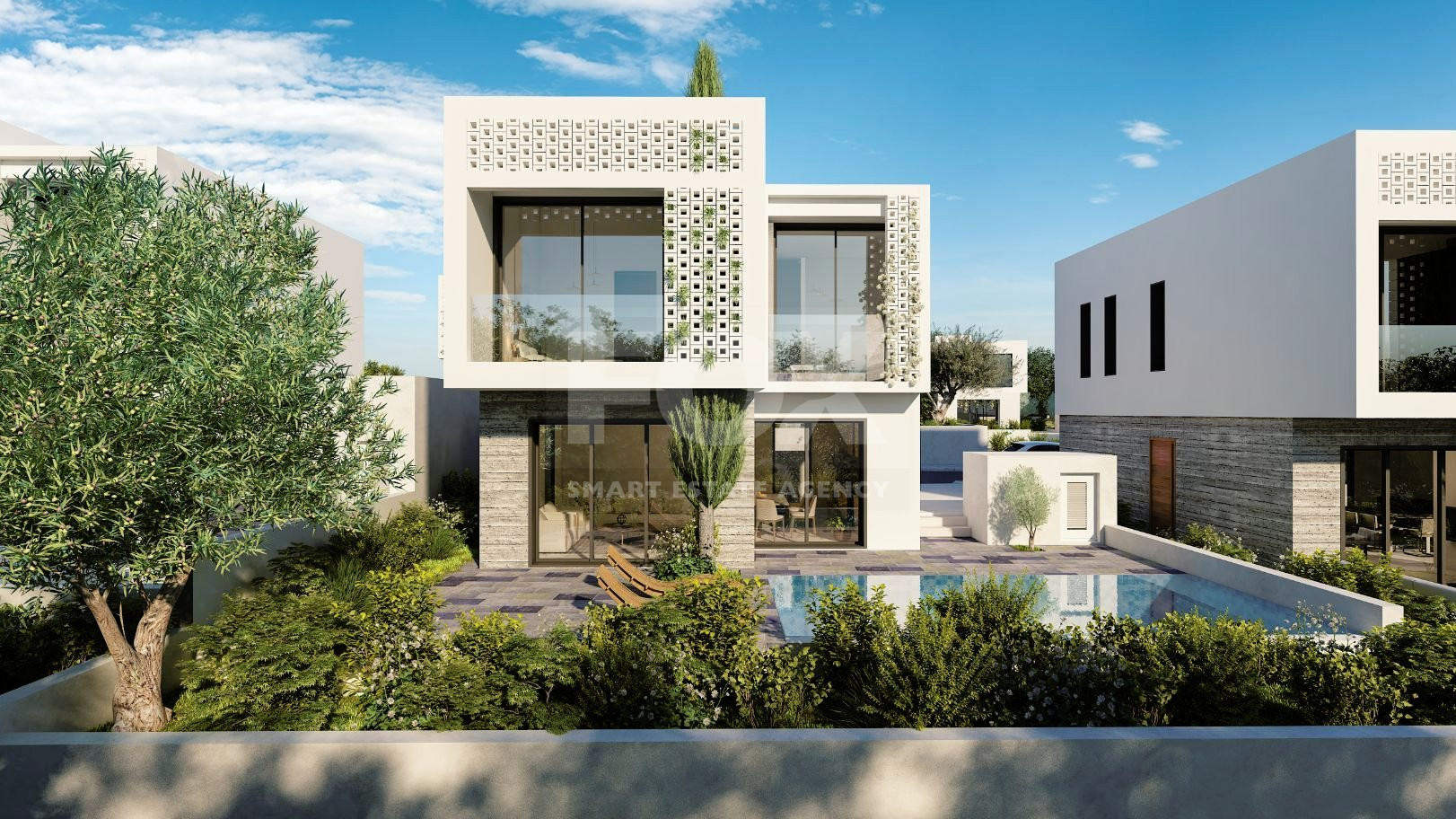 These 3-bedroom magnificent villas for sale in Paphos, ingeniously blend the use of white finishes and fair face concrete, with decorative walls also featuring concrete blocks.