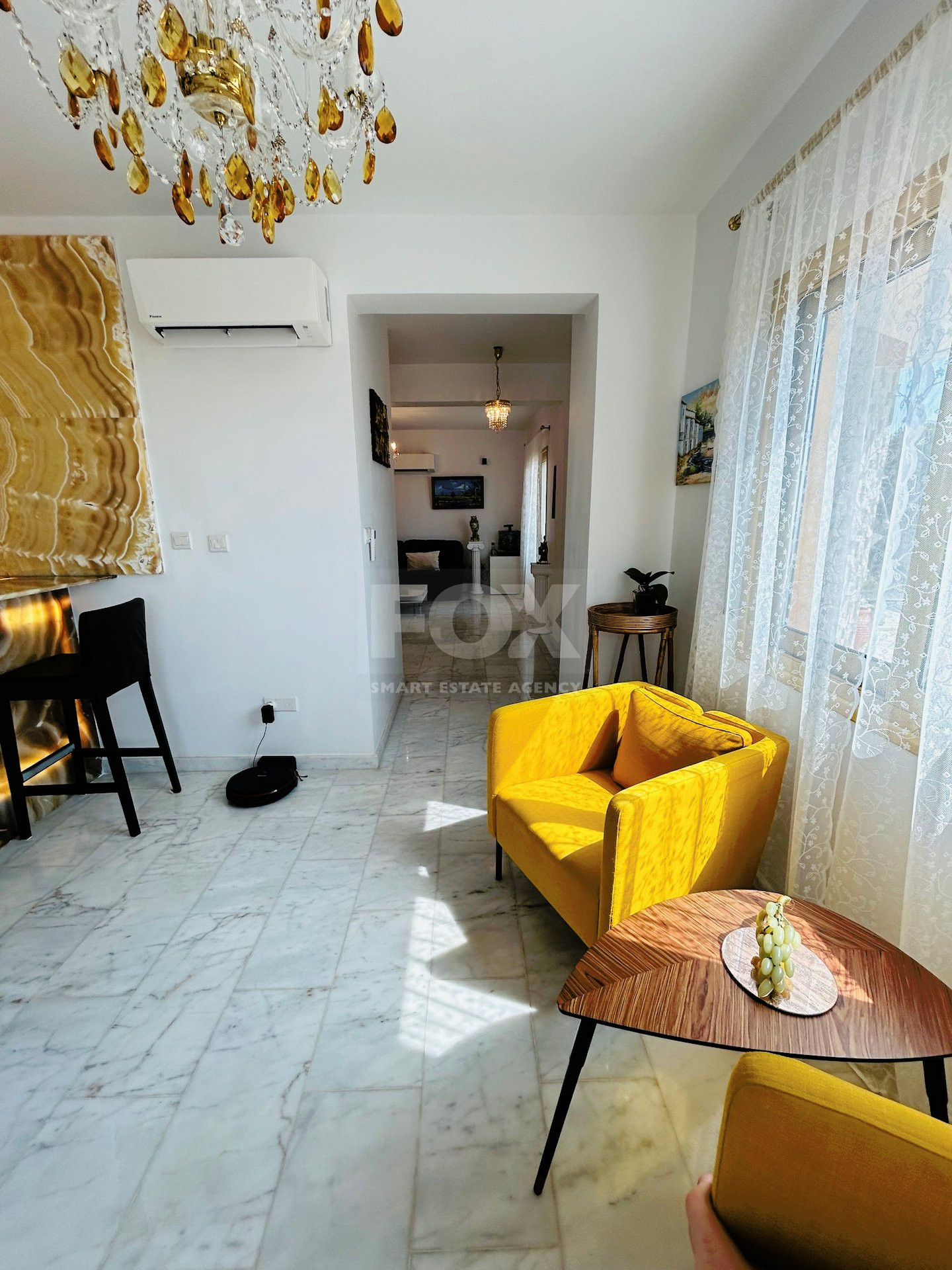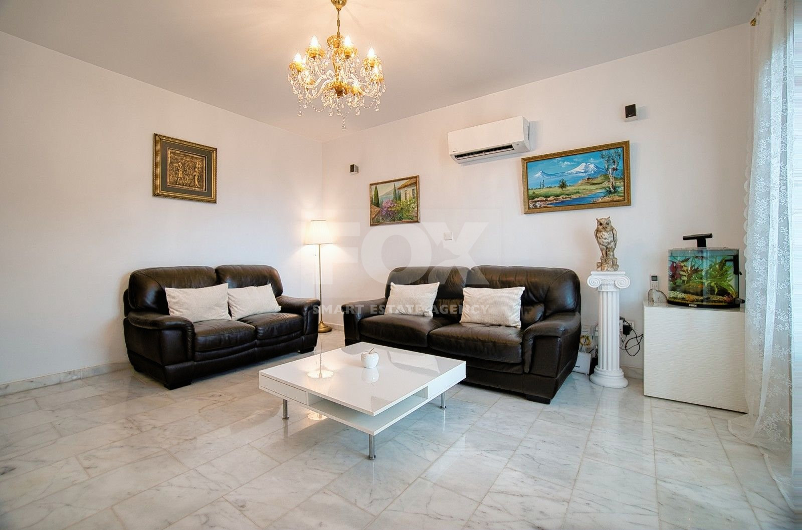 The villa is decorated with marble, which gives it a delightful look. It is located on a hillside.
