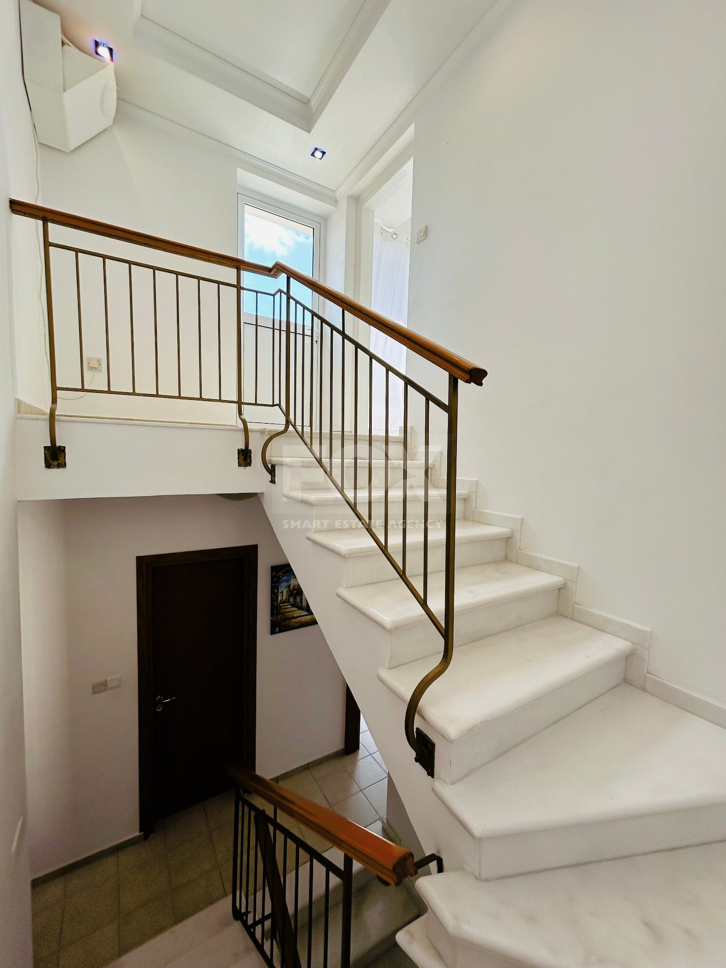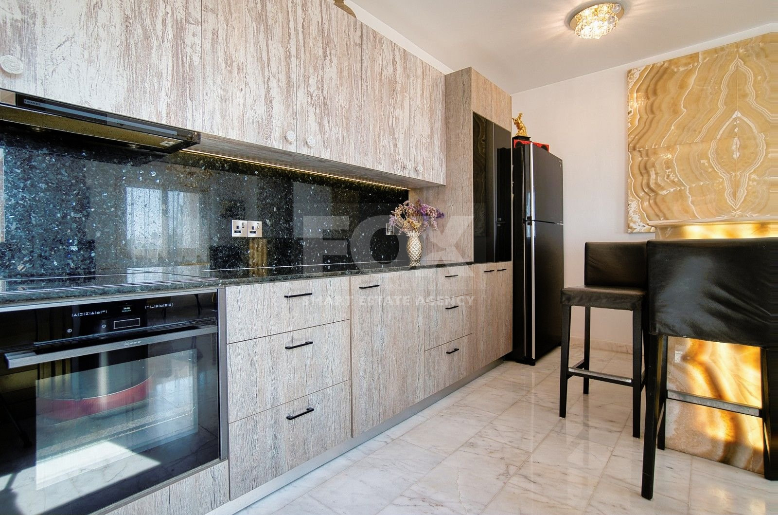 The house has three floors. The layout of the first floor consists of a living room/recreation areas, open-plan kitchens with a beautifully decorated bar counter decorated with an illuminated onyx composition. There is also a guest toilet and a separate laundry/utility room on this level.
